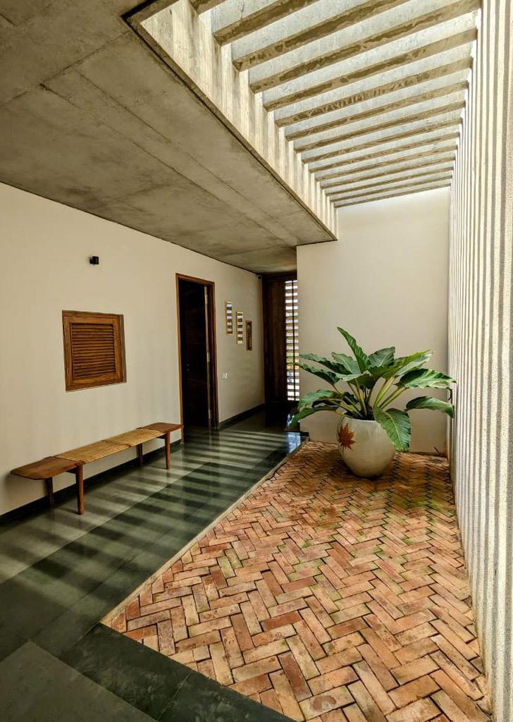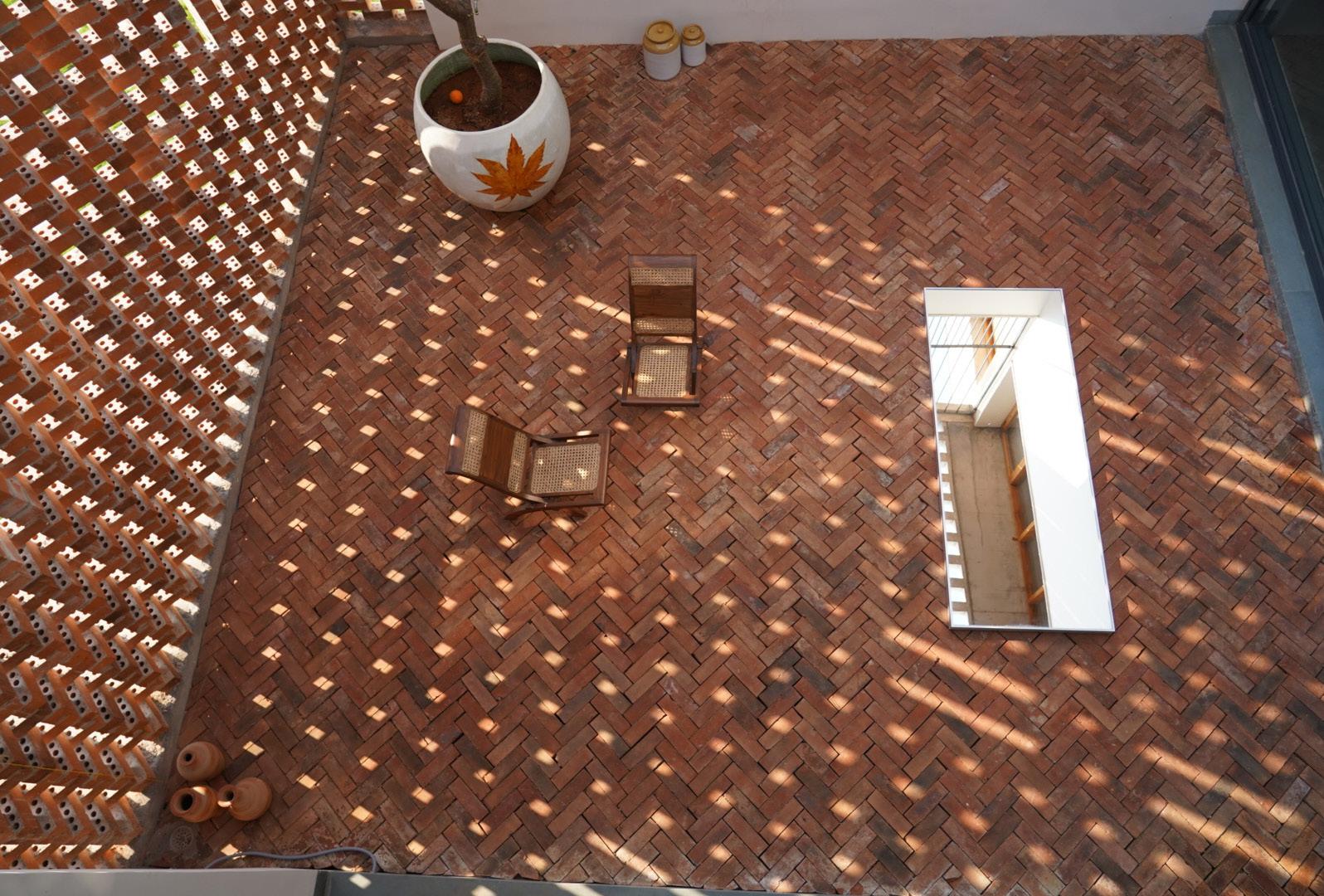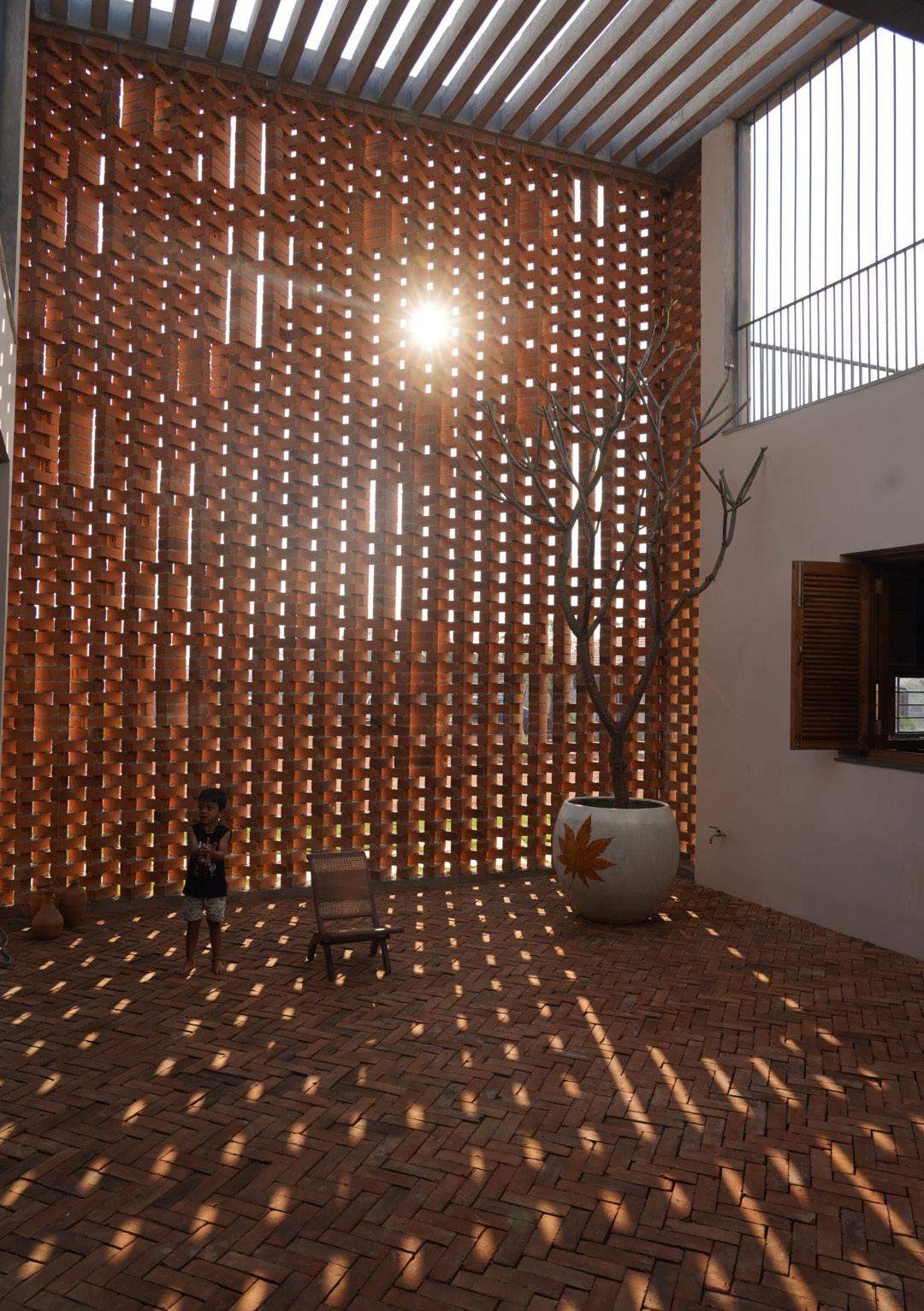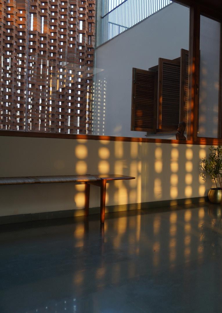 Exposed brick jali ingeniously/adroitly defines the house. It becomes the source of filtered light and ventilation in the house, making the whole space feel dynamic and giving a sense of vitality to the house.
