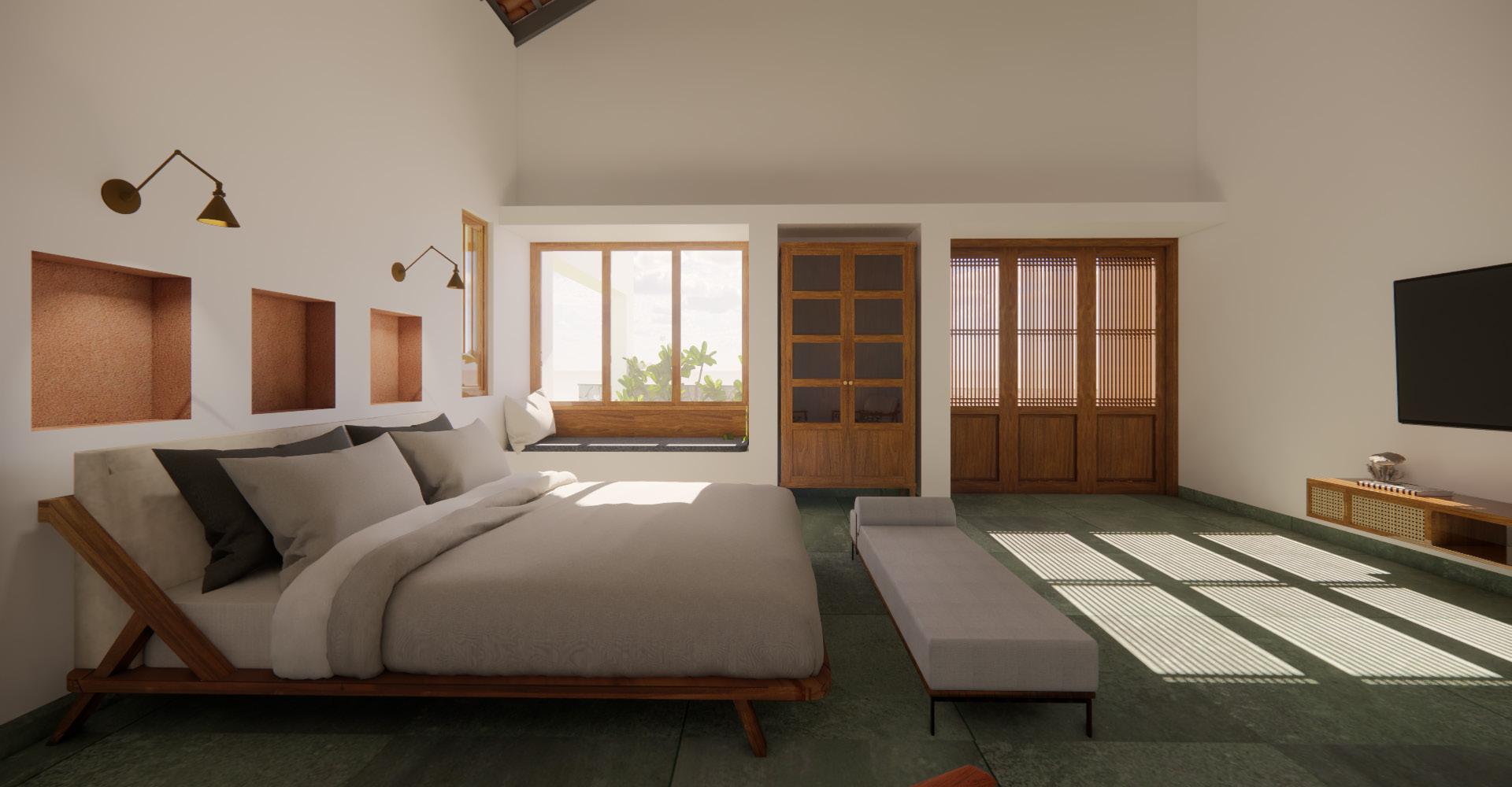 This spaces feels like a poetic interaction between light, material, and nature. The raw concrete ceiling and polished stone flooring ground the space in honesty, while the warm wooden windows soften it, letting in dappled light that moves like a living element throughout the day.