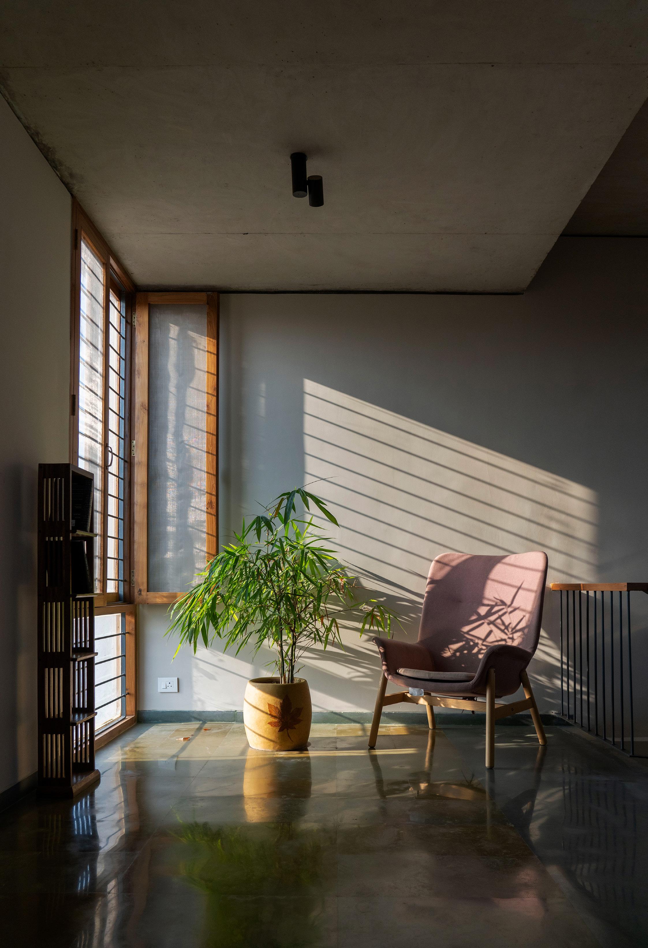 There’s something deeply calming about how the filtered sunlight creates shadows that dance on the walls, blurring the line between the built and the natural. The inviting armchair feels like the perfect spot to pause, reflect, or just exist in stillness.