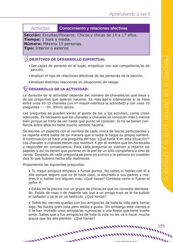 VDESARROLLO DE LA ACTIVIDAD: La duración de la actividad depende del número de chavales/as que haya y de las preguntas que quieran hacerse. Es más ágil e interesante si se hace entre unos 10-15 chavales (un nº mayor ralentiza la actividad) y con unas 10 preguntas ----1h. 30min aprox. Las preguntas se pueden variar al gusto de las y los scouters, como crean adecuado. Es necesario que los chavales y chavalas se conozcan más o menos bien porque se trata de ver hasta qué punto se conocen. Si no se tienen confianza entre ellos no tiene mucho sentido hacerla. Se escribe un papelito con el nombre de cada uno/a de los/as participantes y se reparte entre todos de tal manera que a nadie le toque su propio nombre. A continuación se hace una pregunta del tipo ‘¿Qué haría X en esta situación?’ Los chavales y chavalas tienen que sustituir X por el nombre que les ha tocado y responder en consecuencia. Para cada pregunta se vuelven a repartir los papeles y así no tienen que ponerse en la piel de un sólo compañero/a sino de varios. Después de cada pregunta se pone en común y la persona en cuestión dice lo que hubiera hecho ella realmente. Proponemos las siguientes preguntas: • Tu mejor amigo/a empieza a fumar porros. No sabes si hablar con él o ella porque seguro que no te hace caso, si decírselo a sus padres y madres o si hablar con alguien más. ¿Qué haces? Contesta como si fueras el señor X.