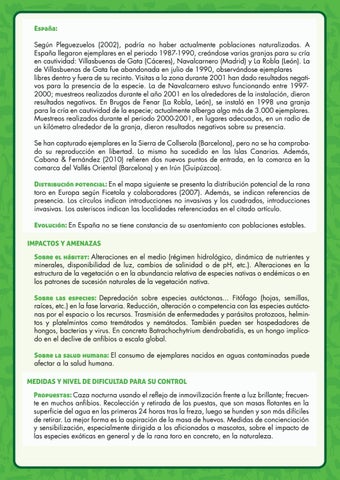 España: Según Pleguezuelos (2002), podría no haber actualmente poblaciones naturalizadas. A España llegaron ejemplares en el periodo 1987-1990, creándose varias granjas para su cría en cautividad: Villasbuenas de Gata (Cáceres), Navalcarnero (Madrid) y La Robla (León). La de Villasbuenas de Gata fue abandonada en julio de 1990, observándose ejemplares libres dentro y fuera de su recinto. Visitas a la zona durante 2001 han dado resultados negativos para la presencia de la especie. La de Navalcarnero estuvo funcionando entre 19972000; muestreos realizados durante el año 2001 en los alrededores de la instalación, dieron resultados negativos. En Brugos de Fenar (La Robla, León), se instaló en 1998 una granja para la cría en cautividad de la especie; actualmente alberga algo más de 3.000 ejemplares. Muestreos realizados durante el periodo 2000-2001, en lugares adecuados, en un radio de un kilómetro alrededor de la granja, dieron resultados negativos sobre su presencia. Se han capturado ejemplares en la Sierra de Collserola (Barcelona), pero no se ha comprobado su reproducción en libertad. Lo mismo ha sucedido en las Islas Canarias. Además, Cabana & Fernández (2010) refieren dos nuevos puntos de entrada, en la comarca en la comarca del Vallés Oriental (Barcelona) y en Irún (Guipúzcoa). Distribución potencial: En el mapa siguiente se presenta la distribución potencial de la rana toro en Europa según Ficetola y colaboradores (2007). Además, se indican referencias de presencia. Los círculos indican introducciones no invasivas y los cuadrados, introducciones invasivas. Los asteriscos indican las localidades referenciadas en el citado artículo. Evolución: En España no se tiene constancia de su asentamiento con poblaciones estables. IMPACTOS Y AMENAZAS Sobre el hábitat: Alteraciones en el medio (régimen hidrológico, dinámica de nutrientes y minerales, disponibilidad de luz, cambios de salinidad o de pH, etc.). Alteraciones en la estructura de la vegetación o en la abundancia relativa de especies nativas o endémicas o en los patrones de sucesión naturales de la vegetación nativa. Sobre las especies: Depredación sobre especies autóctonas... Fitófago (hojas, semillas, raíces, etc.) en la fase larvaria. Reducción, alteración o competencia con las especies autóctonas por el espacio o los recursos. Trasmisión de enfermedades y parásitos protozoos, helmintos y platelmintos como tremátodos y nemátodos. También pueden ser hospedadores de hongos, bacterias y virus. En concreto Batrachochytrium dendrobatidis, es un hongo implicado en el declive de anfibios a escala global. Sobre la salud humana: El consumo de ejemplares nacidos en aguas contaminadas puede afectar a la salud humana. MEDIDAS Y NIVEL DE DIFICULTAD PARA SU CONTROL Propuestas: Caza nocturna usando el reflejo de inmovilización frente a luz brillante; frecuente en muchos anfibios. Recolección y retirada de las puestas, que son masas flotantes en la superficie del agua en las primeras 24 horas tras la freza, luego se hunden y son más difíciles de retirar. La mejor forma es la aspiración de la masa de huevos. Medidas de concienciación y sensibilización, especialmente dirigida a los aficionados a mascotas, sobre el impacto de las especies exóticas en general y de la rana toro en concreto, en la naturaleza.