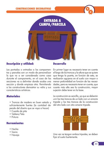 La construcción es sencilla, ya que se deberán unir los tres troncos de un lado con un amarre • Troncos de madera en buen estado y trípode y los tres troncos de la construcción suficientemente fuertes (la cantidad de- del otro lado con otro amarre trípode. pende del diseño que se vaya a hacer) • Cuerda de pita • Tablero/Tela • Pintura