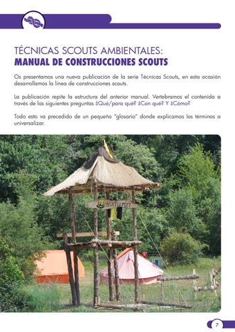 TÉCNICAS SCOUTS AMBIENTALES: MANUAL DE CONSTRUCCIONES SCOUTS Os presentamos una nueva publicación de la serie Técnicas Scouts, en esta ocasión desarrollamos la línea de construcciones scouts. La publicación repite la estructura del anterior manual. Vertebramos el contenido a través de las siguientes preguntas ¿Qué/para qué? ¿Con qué? Y ¿Cómo? Todo esto va precedido de un pequeño “glosario” donde explicamos los términos a universalizar.