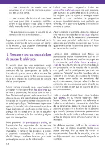 • Una ceremonia de envío rover al Habrá que tener preparados todos los amanecer en un cruce de caminos a poder elementos materiales que nos sean precisos, ser con un río cerca. por ejemplo las pañoletas para la promesa, los objetos que se vayan a entregar como • Una promesa de lobatos al anochecer recuerdo o como símbolos de progresión con una gran roca a nuestras espaldas o como agradecimientos, una guitarra, ya sobre la que colocar unas velas, el tótem afinada, en el caso que durante la ceremonia de la manada y a la luz de unas antorchas. se vaya a cantar… • La promesa de un castor a la orilla de un Aprovechando el ejemplo, debemos recordar remanso del río a media tarde… una vez más la necesidad de ensayar algunas de las partes de la ceremonia previamente Lugares y momentos con la intimidad de la lo que nos permitirá seleccionar el tono unidad, al abrigo de curiosos que son ajenas adecuado para todos, comprobar que no nos a la misma y que puedan distraernos del quedaremos solos los scouters porque el resto motivo central de la misma. no se saben la canción….
