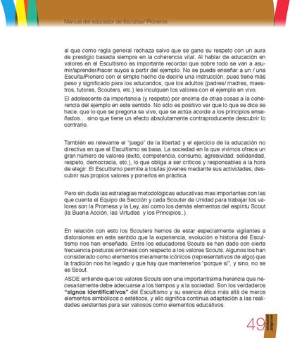 al que como regla general rechaza salvo que se gane su respeto con un aura de prestigio basada siempre en la coherencia vital. Al hablar de educación en valores en el Escultismo es importante recordar que sobre todo se van a asumir/aprender/hacer suyos a partir del ejemplo. No se puede enseñar a un / una Esculta/Pionero con el simple hecho de decirle una instrucción, pues tiene más peso y significado para los educandos, que los adultos (padres/ madres, maestros, tutores, Scouters, etc.) les inculquen los valores con el ejemplo en vivo. El adolescente da importancia (y respeta) por encima de otras cosas a la coherencia del ejemplo en este sentido. No sólo es positivo ver que lo que se dice se hace, que lo que se pregona se vive, que se actúa acorde a los principios enseñados… sino que tiene un efecto absolutamente contraproducente descubrir lo contrario. También es relevante el “juego” de la libertad y el ejercicio de la educación no directiva en que el Escultismo se basa. La sociedad en la que vivimos ofrece un gran número de valores (éxito, competencia, consumo, agresividad, solidaridad, respeto, democracia, etc.), lo que obliga a ser críticos y responsables a la hora de elegir. El Escultismo permite a los/las jóvenes mediante sus actividades, descubrir sus propios valores y ponerlos en práctica. Pero sin duda las estrategias metodológicas educativas mas importantes con las que cuenta el Equipo de Sección y cada Scouter de Unidad para trabajar los valores son la Promesa y la Ley, así como los demás elementos del espíritu Scout (la Buena Acción, las Virtudes y los Principios..). En relación con esto los Scouters hemos de estar especialmente vigilantes a distorsiones en este sentido que la experiencia, evolución e historia del Escultismo nos han enseñado. Entre los educadores Scouts se han dado con cierta frecuencia posturas erróneas con respecto a los valores Scouts. Algunos los han considerado como elementos meramente icónicos (representativos de algo) que la tradición nos ha legado y que hay que mantenerlos “porque sí”, y sino, no se es Scout.