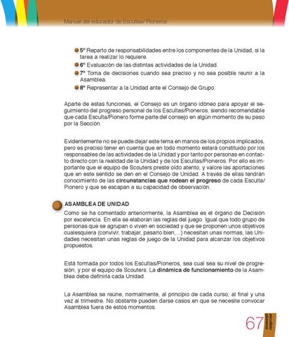 5º Reparto de responsabilidades entre los componentes de la Unidad, si la tarea a realizar lo requiere. 6º Evaluación de las distintas actividades de la Unidad. 7º Toma de decisiones cuando sea preciso y no sea posible reunir a la Asamblea. 8º Representar a la Unidad ante el Consejo de Grupo. Aparte de estas funciones, el Consejo es un órgano idóneo para apoyar el seguimiento del progreso personal de los Escultas/Pioneros, siendo recomendable que cada Esculta/Pionero forme parte del consejo en algún momento de su paso por la Sección. Evidentemente no se puede dejar este tema en manos de los propios implicados, pero es preciso tener en cuenta que en todo momento estará constituido por los responsables de las actividades de la Unidad y por tanto por personas en contacto directo con la realidad de la Unidad y de los Escultas/Pioneros. Por ello es importante que el equipo de Scouters preste oído atento, y valore las aportaciones que en este sentido se den en el Consejo de Unidad. A través de ellas tendrán conocimiento de las circunstancias que rodean el progreso de cada Esculta/ Pionero y que se escapan a su capacidad de observación. ASAMBLEA DE UNIDAD