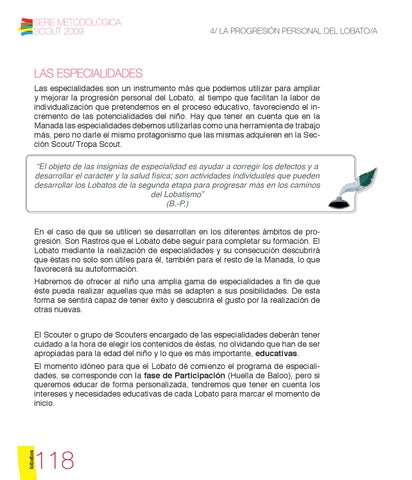 LAS ESPECIALIDADES Las especialidades son un instrumento más que podemos utilizar para ampliar y mejorar la progresión personal del Lobato, al tiempo que facilitan la labor de individualización que pretendemos en el proceso educativo, favoreciendo el incremento de las potencialidades del niño. Hay que tener en cuenta que en la Manada las especialidades debemos utilizarlas como una herramienta de trabajo más, pero no darle el mismo protagonismo que las mismas adquieren en la Sección Scout/ Tropa Scout. “El objeto de las insignias de especialidad es ayudar a corregir los defectos y a desarrollar el carácter y la salud física; son actividades individuales que pueden desarrollar los Lobatos de la segunda etapa para progresar más en los caminos del Lobatismo” (B.-P.) En el caso de que se utilicen se desarrollan en los diferentes ámbitos de progresión. Son Rastros que el Lobato debe seguir para completar su formación. El Lobato mediante la realización de especialidades y su consecución descubrirá que éstas no solo son útiles para él, también para el resto de la Manada, lo que favorecerá su autoformación.