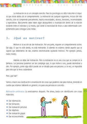 Motivar es la acción de dar motivación. Por una parte, requiere un comportamiento activo. Dar algo. El que no esté dando, no está motivando. Si además no estamos dando aquello que se supone que deberíamos de dar, estamos desmotivando (quitando motivos). Por ejemplo: peleas, malos modos. Además se debe dar motivación. Pero la motivación no es una cosa que se compre en la farmacia. Las personas podemos ser tan complejas que, lo que motiva a uno, puede desmotivar a otro. Por ejemplo, poner algo difícil puede ser un desafío para una persona y a la vez, un imposible para otra que la lleve a abandonar. Pero ¿qué dar? Vamos a hacer una clasificación o enumeración de cosas que podemos dar para motivar, teniendo en cuenta que estamos hablando en general y no para una persona en concreto: Motivación extrínseca: Lo analizaremos después. Por ahora, basta con identificarla con cosas materiales. u Dar información. u Dar formación. u u u u