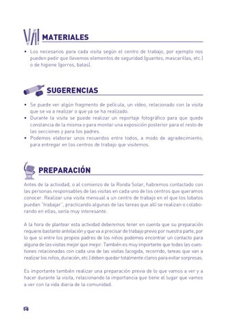 PREPARACIÓN Antes de la actividad, o al comienzo de la Ronda Solar, habremos contactado con las personas responsables de las visitas en cada uno de los centros que queramos conocer. Realizar una visita mensual a un centro de trabajo en el que los lobatos puedan “trabajar”, practicando algunas de las tareas que allí se realizan o colaborando en ellas, sería muy interesante. A la hora de plantear esta actividad deberemos tener en cuenta que su preparación requiere bastante antelación y que va a precisar de trabajo previo por nuestra parte, por lo que si entre los propios padres de los niños podemos encontrar un contacto para alguna de las visitas mejor que mejor. También es muy importante que todas las cuestiones relacionadas con cada una de las visitas (acogida, recorrido, tareas que van a realizar los niños, duración, etc.) deben quedar totalmente claros para evitar sorpresas. Es importante también realizar una preparación previa de lo que vamos a ver y a hacer durante la visita, relacionando la importancia que tiene el lugar que vamos a ver con la vida diaria de la comunidad.
