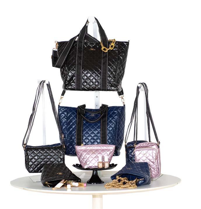 REACTION TO OUR NEW COLLECTIONS at Dallas + Atlanta Markets was phenomenal . Solid (pun intended) standouts included our cozy new Puffer and chic quilted Luxe (esp the dusty pink) collections For holiday, our pink + red checkerboard print was a showstopper, along with our novelty ski slope pattern . New styles on everyone’s list included the Beauty Gordito hanging toiletry bag, Triple Advisor 3-in-1 travel bag, and On the Clock tote bag