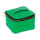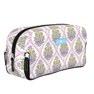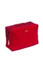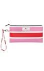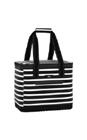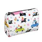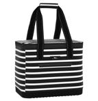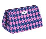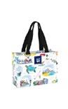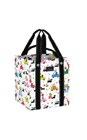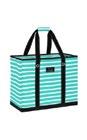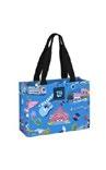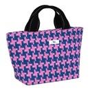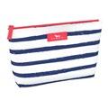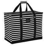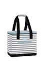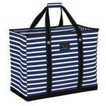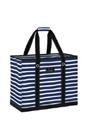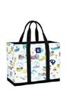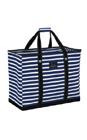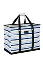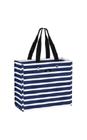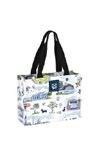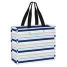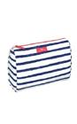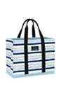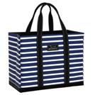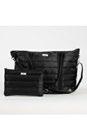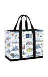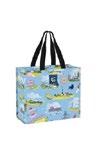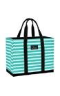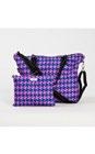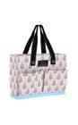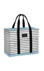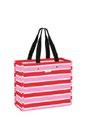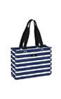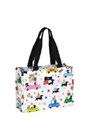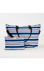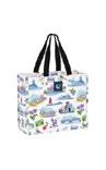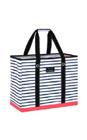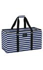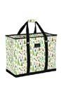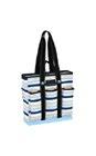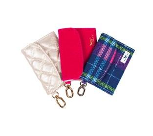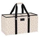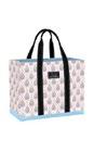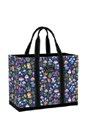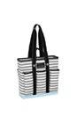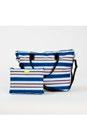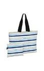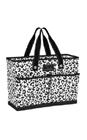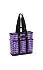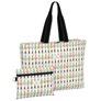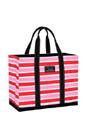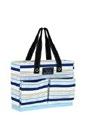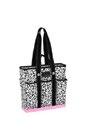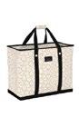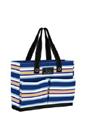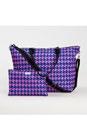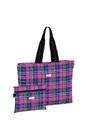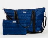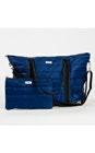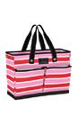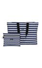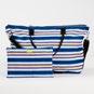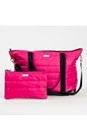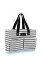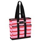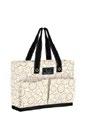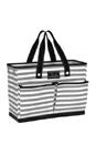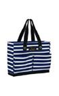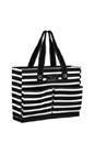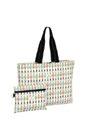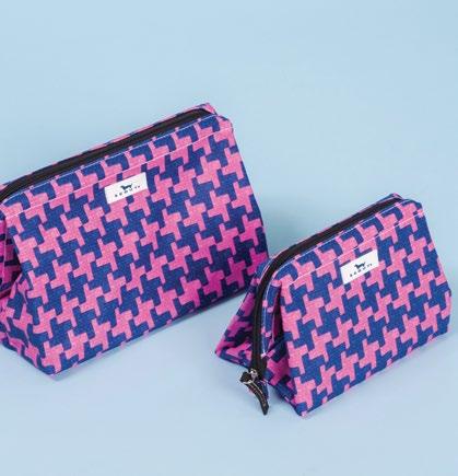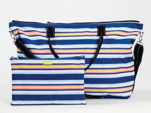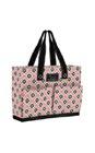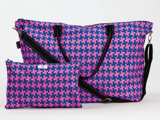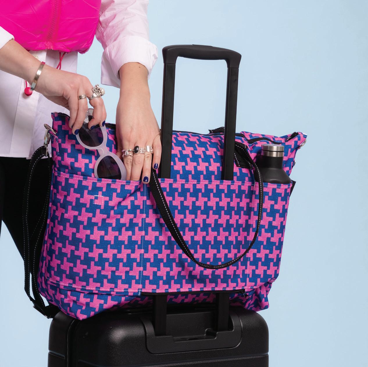 Two slip pockets on back of tote • Trolley sleeve to slide over luggage handle • Zipper compartment at top of trolley sleeve for extra organization • Pouch attaches inside tote • Tote and pouch both become crossbodies with adjustable, removable strap