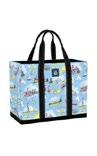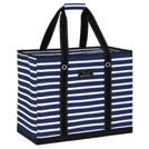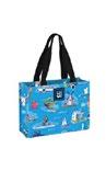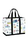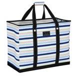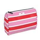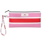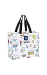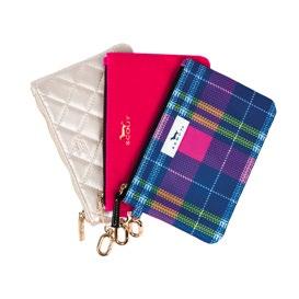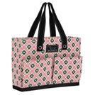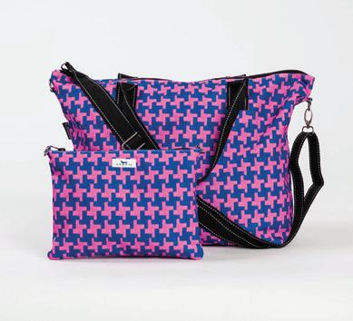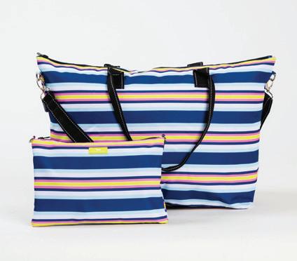 Two slip pockets on back of tote • Trolley sleeve to slide over luggage handle • Zipper compartment at top of trolley sleeve for extra organization • Pouch attaches inside tote • Tote and pouch both become crossbodies with adjustable, removable strap