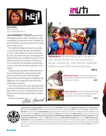 Nybörjare. Nya kompisar och nya aktiviteter, det är mycket nytt när man precis börjat i Scouterna. Följ med när seglande spårarscouter från Solna kastar loss. sid 4 Håll huvudet varmt. Scoutens tespatrull har testat mössor. Kolla in vilka som är bäst och vilka du ska undvika. sid 8