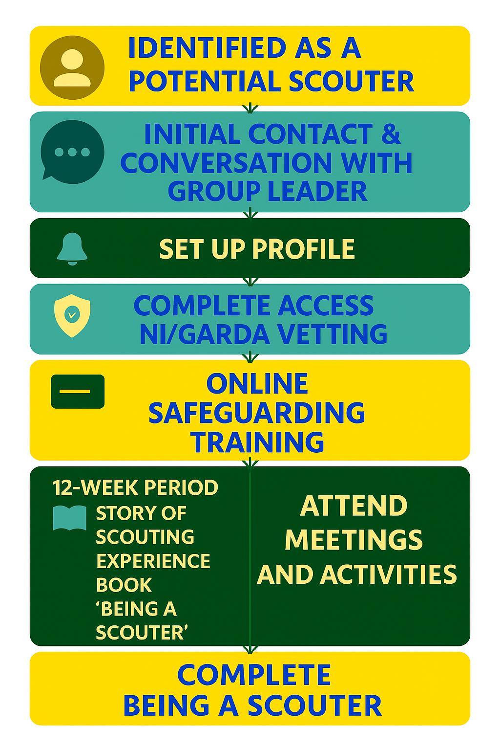7. On completion of Garda Vetting/Access NI (Each applicant will receive official confirmation from the statutory agency as will Scouting Ireland) the 12-week process begins from this date.