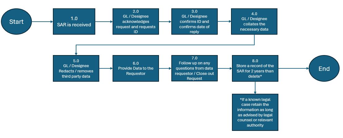 • Save a copy of all communications in relation to the SAR as well as copies of the data provided – suggested retention is 2 years from the time the SAR is completed to allow time for follow ups / disputes and resolutions.