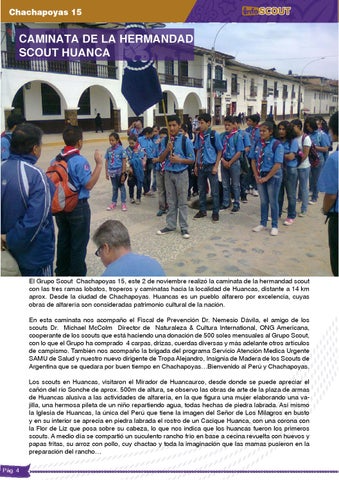 El Grupo Scout Chachapoyas 15, este 2 de noviembre realizó la caminata de la hermandad scout con las tres ramas lobatos, troperos y caminatas hacia la localidad de Huancas, distante a 14 km aprox. Desde la ciudad de Chachapoyas. Huancas es un pueblo alfarero por excelencia, cuyas obras de alfarería son consideradas patrimonio cultural de la nación. En esta caminata nos acompaño el Fiscal de Prevención Dr. Nemesio Dávila, el amigo de los scouts Dr. Michael McColm Director de Naturaleza & Cultura International, ONG Americana, cooperante de los scouts que está haciendo una donación de 500 soles mensuales al Grupo Scout, con lo que el Grupo ha comprado 4 carpas, drizas, cuerdas diversas y más adelante otros artículos de campismo. También nos acompaño la brigada del programa Servicio Atención Medica Urgente SAMU de Salud y nuestro nuevo dirigente de Tropa Alejandro, Insignia de Madera de los Scouts de Argentina que se quedara por buen tiempo en Chachapoyas…Bienvenido al Perú y Chachapoyas. Los scouts en Huancas, visitaron el Mirador de Huancaurco, desde donde se puede apreciar el cañón del río Sonche de aprox. 500m de altura, se observo las obras de arte de la plaza de armas de Huancas alusiva a las actividades de alfarería, en la que figura una mujer elaborando una vajilla, una hermosa pileta de un niño repartiendo agua, todas hechas de piedra labrada. Así mismo la Iglesia de Huancas, la única del Perú que tiene la imagen del Señor de Los Milagros en busto y en su interior se aprecia en piedra labrada el rostro de un Cacique Huanca, con una corona con la Flor de Liz que posa sobre su cabeza, lo que nos indica que los huancas fueron los primeros scouts. A medio día se compartió un suculento rancho frío en base a cecina revuelta con huevos y papas fritas, su arroz con pollo, cuy chactao y toda la imaginación que las mamas pusieron en la preparación del rancho… Pág. 4