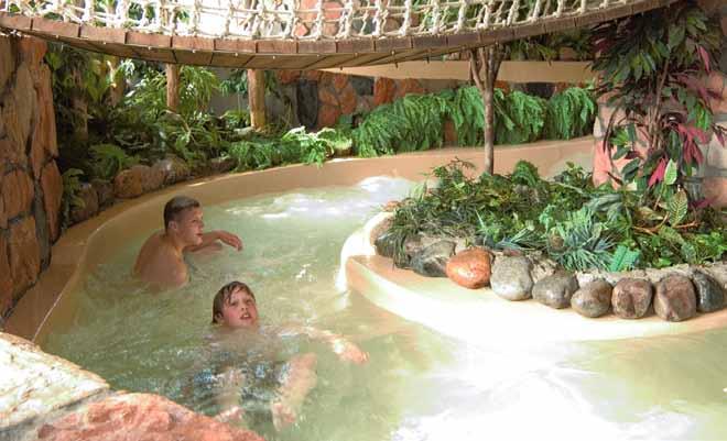 I en djungelliknade miljö kastar du dig ut i Europas längsta och högsta vildvattenfors med hängbroar, laguner och pooler. Prova också våra tre häftiga vattenrutschar, klättermuren, stora vågbassängen och akvariebassängen med levande hajar och rockor. De yngsta har ett helt badlandskap med ”snälla” vattenrutschar, pooler mm.