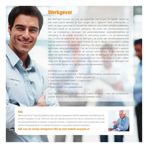 Wat is payrolling? Payrolling betekend dat u zelf uw medewerker werft en selecteert maar WePay4U de juridisch werkgever wordt. WePay4U sluit een arbeidsovereenkomst met uw werknemer en verzorgt de salarisadministratie en betaling. U bepaald wanneer u medewerker werkt, plant de vakanties, voert functioneringsgesprekken en bepaald het salaris en secundaire arbeidsvoorwaarden.
