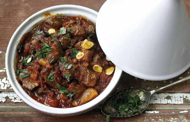 • In una padella separata, scalda l’olio rimanente e fai rosolare i cubetti di agnello su tutti i lati e aggiungi poi la carne ben rosolata agli ingredienti disposti nella casseruola. Nella padella dove hai rosolato l’agnello aggiungi un pò di succo di pomodoro per sgrassare e aggiungi il liquido agli ingredienti nella casseruola. Aggiungi il succo di pomodoro rimasto, i pomodori a pezzetti, le albicocche, i datteri, l’uvetta, le mandorle, lo zafferano, il brodo di agnello e il miele. Porta a bollore, copri con un coperchio e posiziona nel forno. Fai cuocere per 2 -2 ore e 1/2 o fino a che la carne è tenera e si sfalda. Posiziona l’agnello nel tajine o in un piatto di portata e cospargi con le erbe. Servi ben caldo.