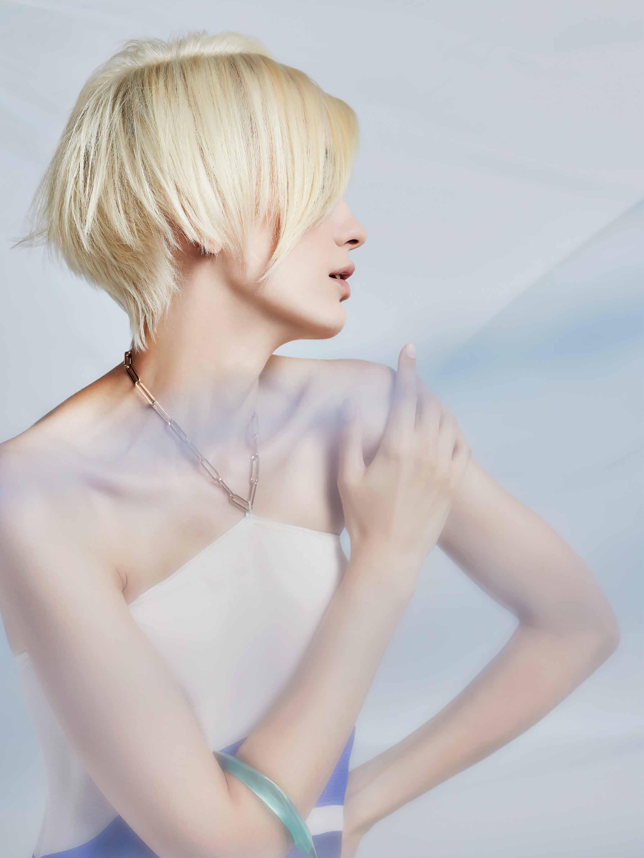 Una linea morbida, fluida e femminile, carica di movimento grazie ad una sfumatura importante dietro la nuca e una irregolarità generale che si definisce meglio sui perimetri. Il ciuffo con punta centrale può muoversi in tutte le direzioni sottolineando flessibilità e dinamismo. Il biondo freddo dona con un tocco grintoso, una spinta contemporanea e sofisticata.