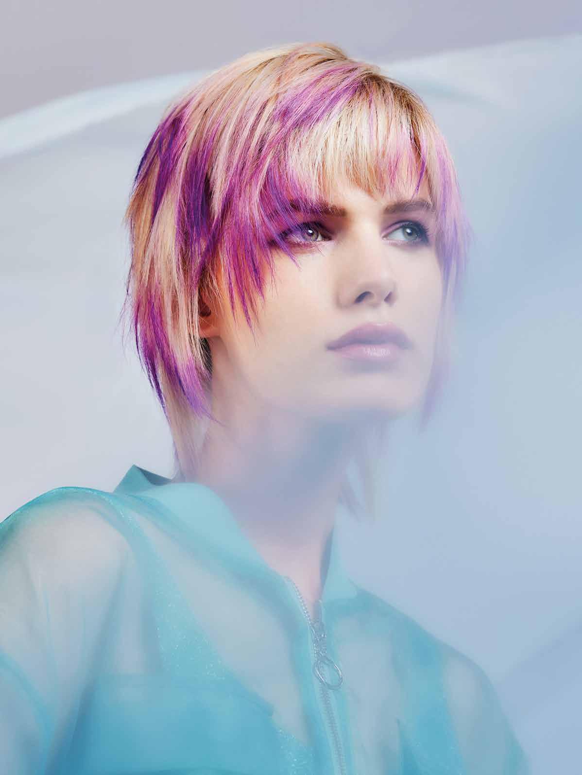 Un look aereo e sbarazzino definito da un taglio irregolare tutto giocato sull’alternanza di ciocche corte e lunghe. Un contrasto dinamico evidenziato da sfumature di colore che accentuano le differenze e arricchiscono il tutto con un ammaliante tocco cromatico dal sicuro effetto.