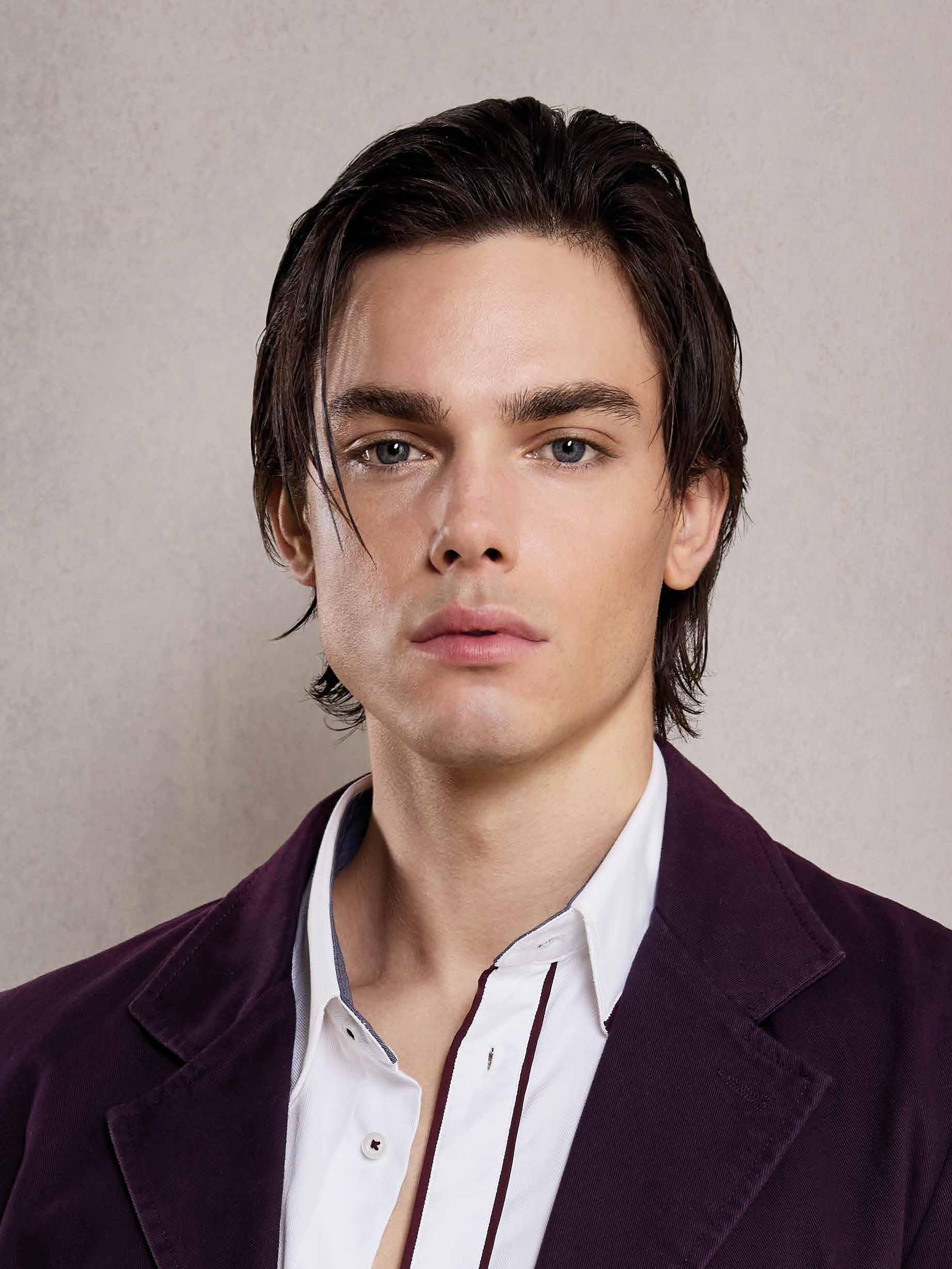 Un wet look su taglio medio-lungo, sempre attuale nel mondo maschile. Può donare un tocco super glam, ricercato e sexy, oppure più disincantato e casual. Con i capelli, pettinati indietro o mossi con le dita, è possibile giocare, evidenziando piccoli dettagli come ciocche sfuggenti o disegnate sul contorno viso.