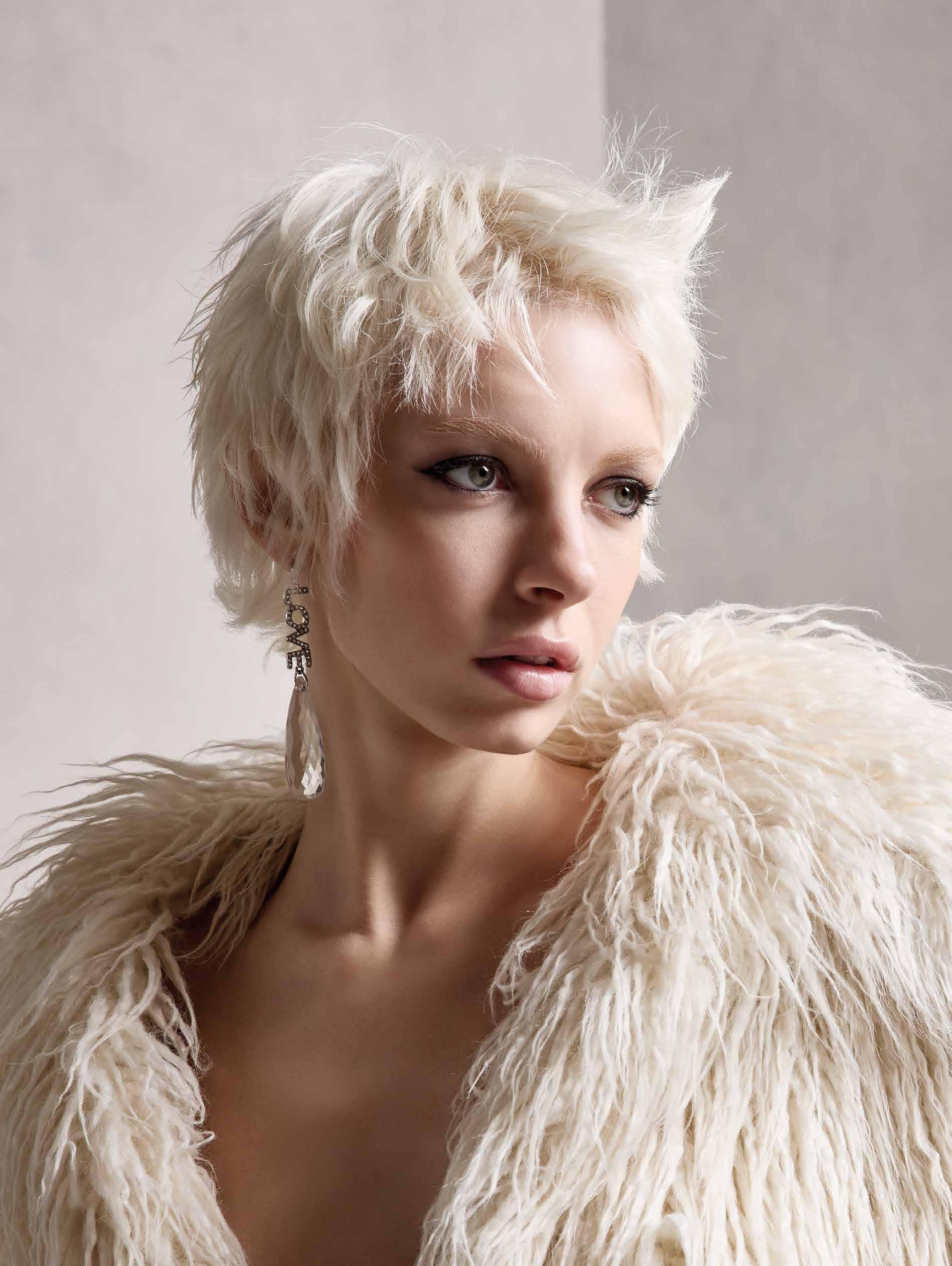 Un look dal fascino contemporaneo ottenuto con taglio pieno, leggermente sfilato per esaltare l’effetto morbido e soffice della capigliatura e contrastare un eventuale aspetto statico. Il tutto è giocato su una asimmetria controllata che si arricchisce di toni biondi sapientemente miscelati in nuance calde e fredde.