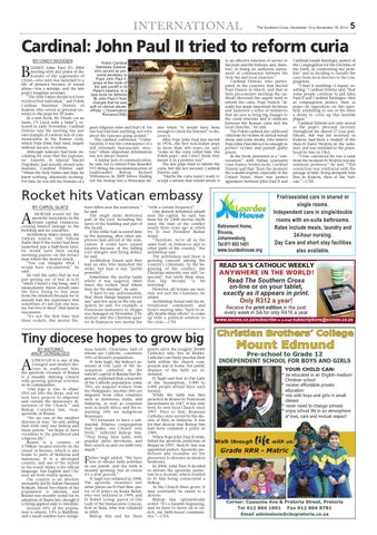 READ SA’S CATHOLIC WEEKLY ANYWHERE IN THE WORLD! read The Southern Cross on-line or on your tablet, exactly as it appears in print. Only r312 a year! Receive the print edition in the post every week in SA for only R416 a year