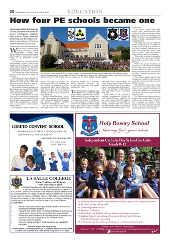 HILE Port Elizabeth’s Holy Rosary Convent, Marist Brothers’ College and Trinity High School no longer exist, their legacies and ethos prevail today in St Dominic’s Priory School. St Dominic’s is a co-educational independent Catholic school from Grade Pre-R to Grade 12. It is the end result of various Port Elizabeth independent Catholic schools coming together on one piece of land. The school has a long and proud history from different corners of the city. Holy Rosary Convent School for junior and high school girls was opened in 1867 by the Cabra Dominican Sisters, who had first arrived in South Africa in 1863. It occupied beautiful premises in Bird Street, in central Port Elizabeth, and many old girls remember especially the chapel fondly. This girls’ school closed in 1982. The junior school girls transferred to St Dominic’s Priory and the high school girls continued their schooling on the same premises—but in a new co-ed school called Trinity High School. St Dominic’s Priory School for