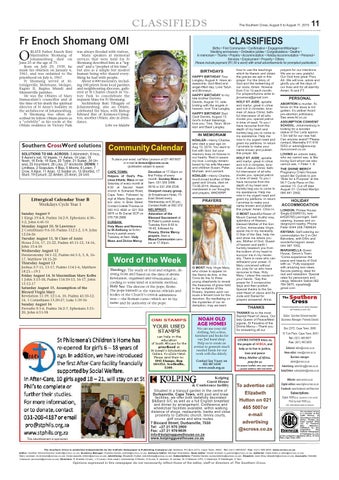 LONDON, Protea House: Single ₤30(R510), twin ₤45(R765) per/night. Selfcatering, busses and underground nearby. Phone Peter 0044 208 7484834. KNYSNA: Self-catering accommodation for 2 in Old Belvidere, with DStv and wonderful lagoon views. 044 387 1052. MARIANELLA Guest House, Simon’s Town: “Come experience the peace and beauty of God with us.” Fully equipped with amazing sea views. Secure parking, ideal for rest and relaxation. Special rates for pensioners and clergy. Malcolm Salida 082 784 5675, mjsalida@ gmail.com The