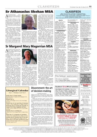 Births • First Communion • Confirmation • Engagement/Marriage • wedding anniversary • ordination jubilee • Congratulations • deaths • In memoriam • thanks • Prayers • Accommodation • Holiday Accommodation • Personal • Services • Employment • Property • others Please include payment (R1,60 a word) with small advertisements for promptest publication.