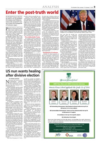 donald Trump’s “cleverly barbed lies were undebunkable”, writes Fr Chris Chatteris SJ in his reflection on the post-truth society. (Photo: CnS) tive” was that the aircraft was brought down by a Ukrainian fighter. The insinuation here was that the incident was staged by the Ukrainian military in order to discredit the separatists. Looking at the evidence this is extremely unlikely, but it is always a remote possibility. And that is enough to cast a modicum of doubt on the weight of the evidence. It is also a conspiracy theory and a lot of people love conspiracy theories. A similar tactic of sowing just enough doubt has been employed by some of the big fossil fuel industries in the United States. Many media outlets cooperated with this by giving a disproportionate amount of airtime to the socalled “climate sceptics”, despite the fact that an overwhelming majority of scientists affirm that climate change is happening and is being enhanced by the excessive burning of coal, oil and gas. But incredibly, enough doubt has been cast on the scientifically demonstrated reality of climate change for such scepticism to become a quasi-credo of the Republi-