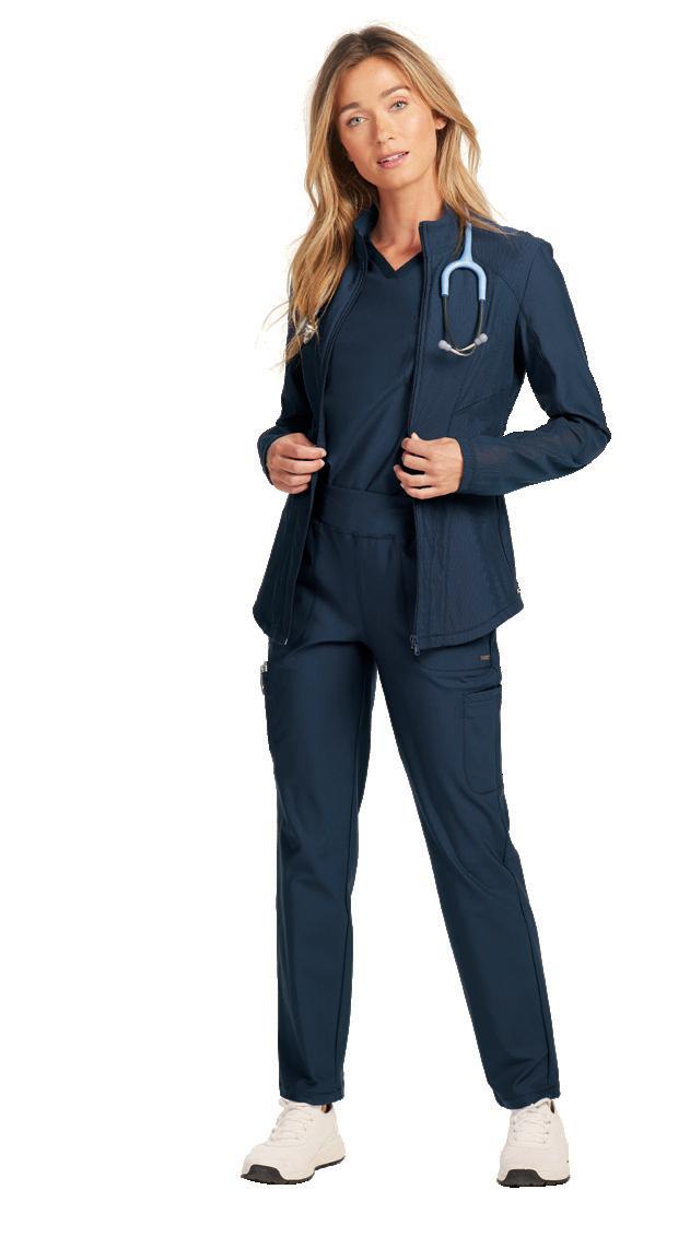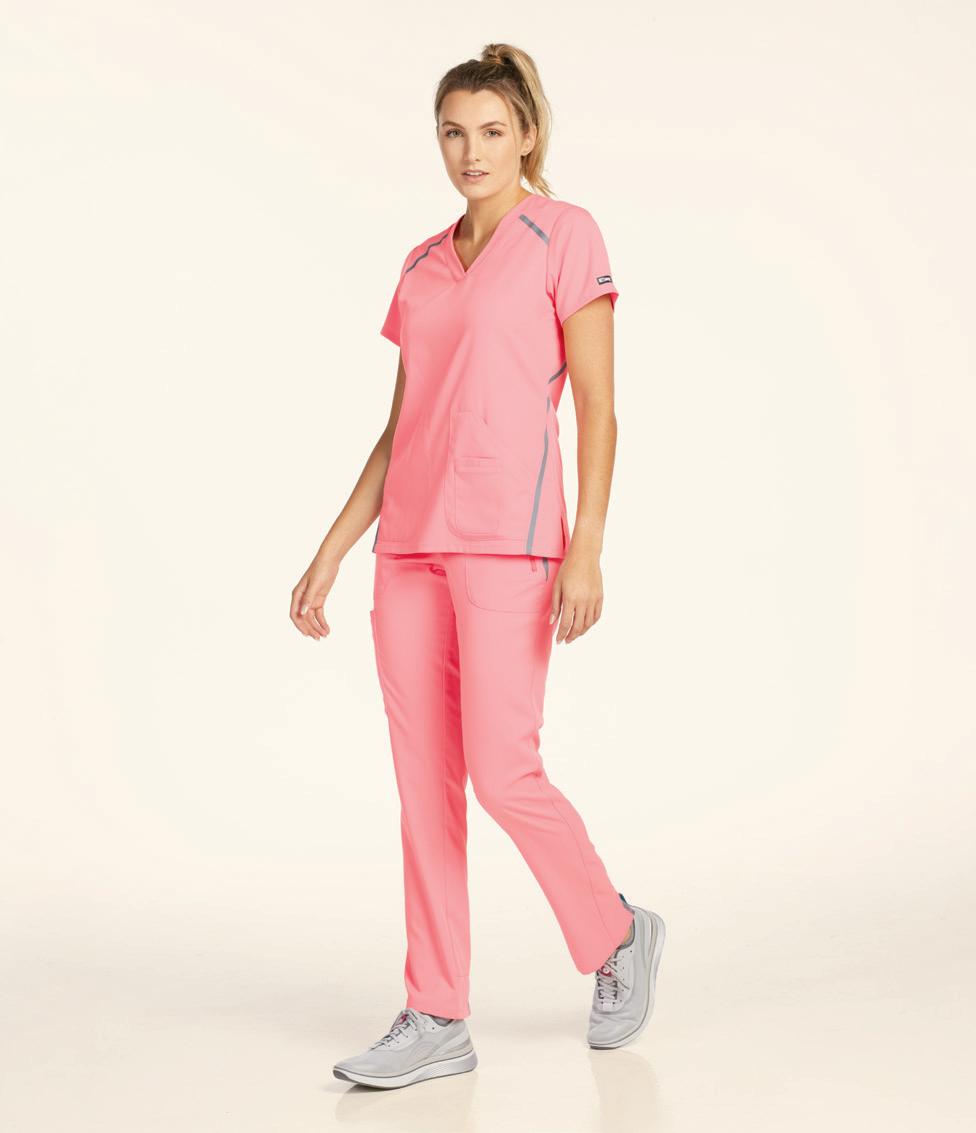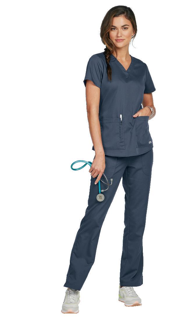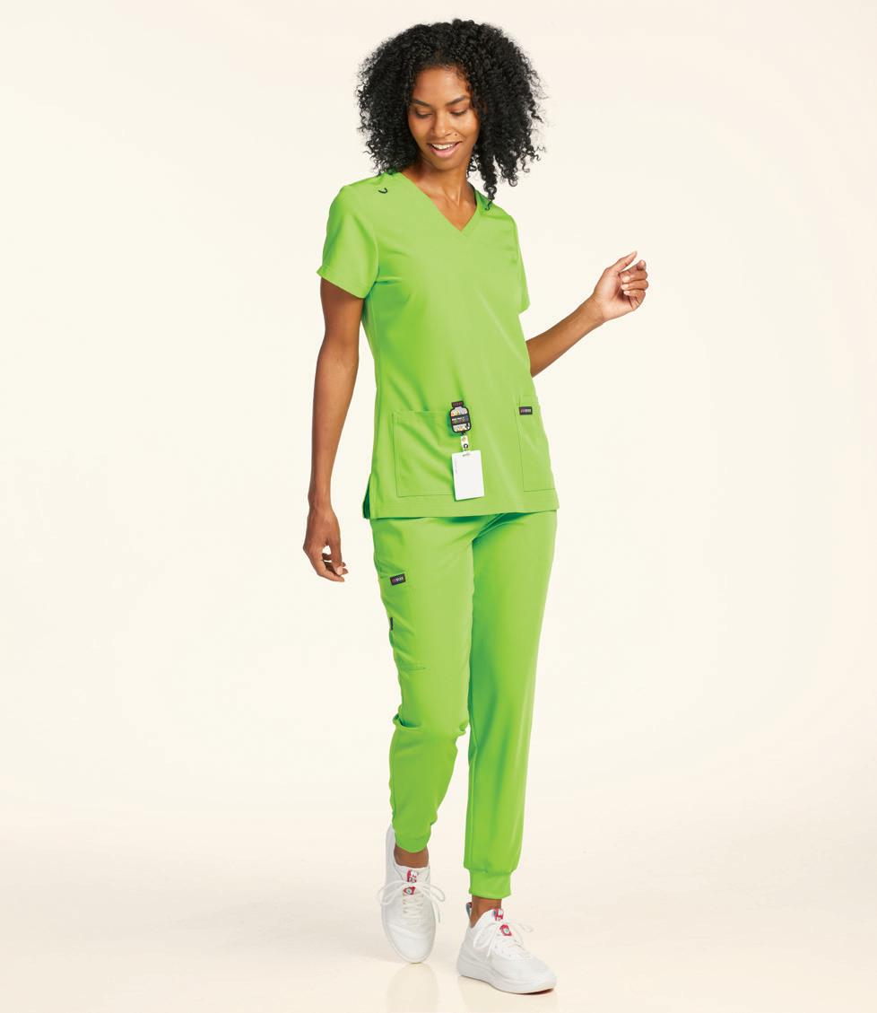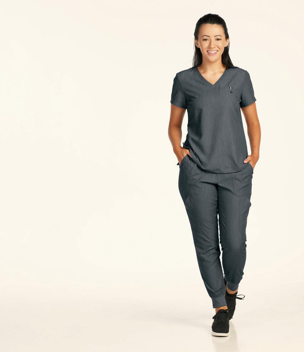 LEFT: GRSW871 React Round Neck Jacket 5 pockets, rib knit cuffs, antimicrobial fabric properties. Starting @ $42.99 GRSP550 Murphy 5-pocket Jogger Rib knit elastic waistband, zip fly, drawstring, knit cuffs, antimicrobial fabric properties. Starting @ $39.99 TOP RIGHT: GRST009 Wesley V-neck Top 3 pockets, badge loop, angled back yoke. Starting @ $32.99 GRSP507 Wesley Cargo Pant 4 pockets, zip fly, tack button closure. Starting @ $38.99 BOTTOM RIGHT: GRSW873 Gianna Round Neck Jacket 5 pockets, rib knit cuffs & back panels, antimicrobial fabric properties. Starting @ $38.99 LEFT: GRST124