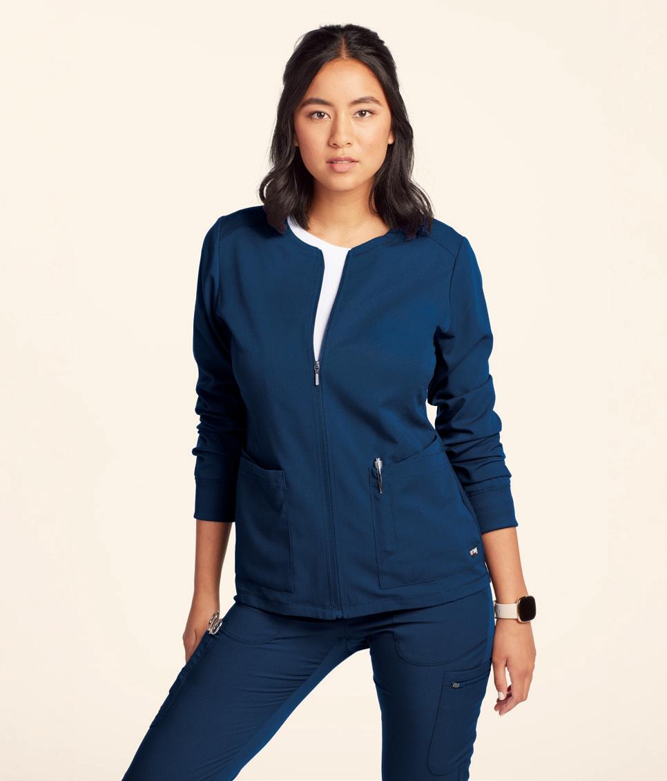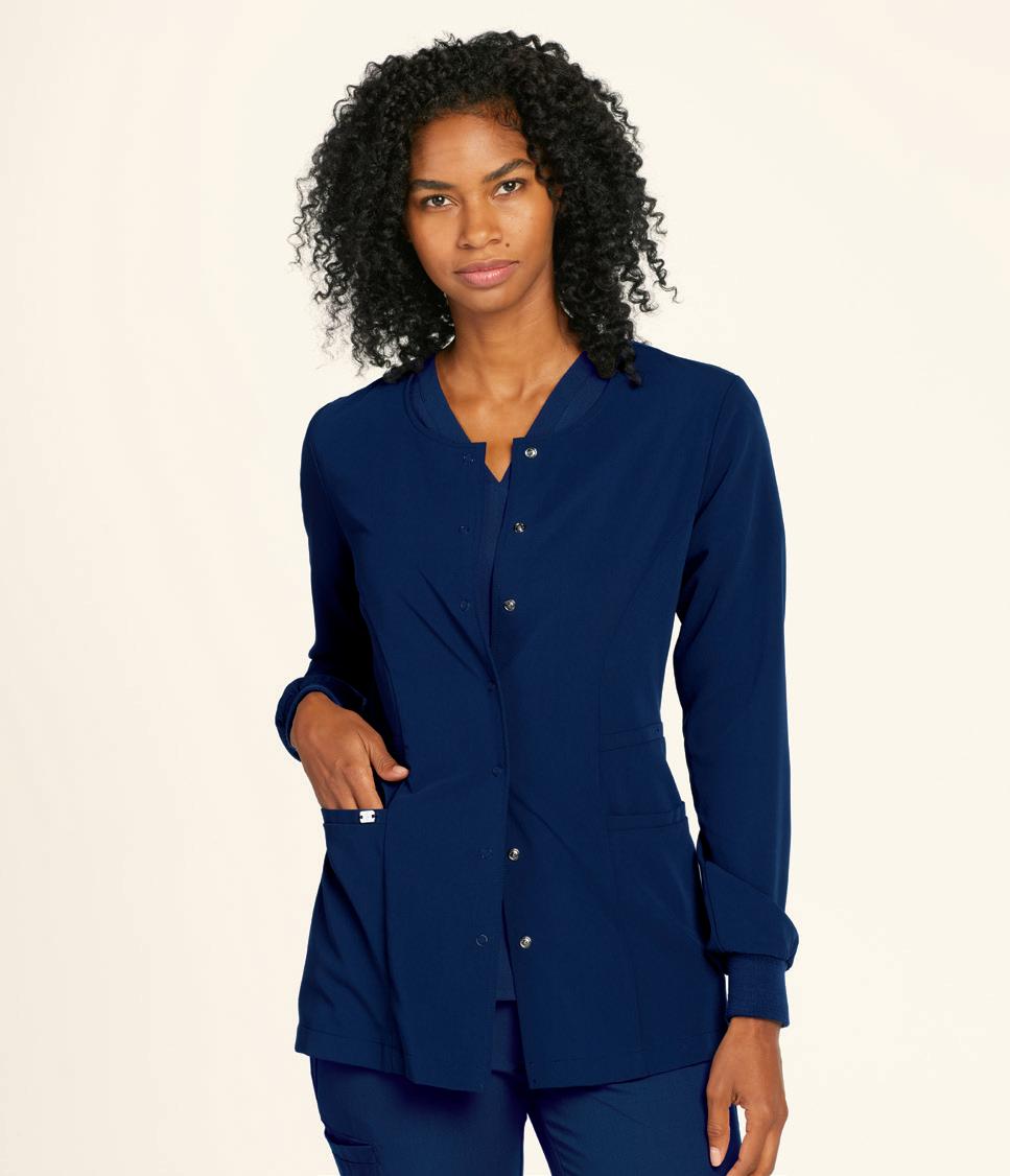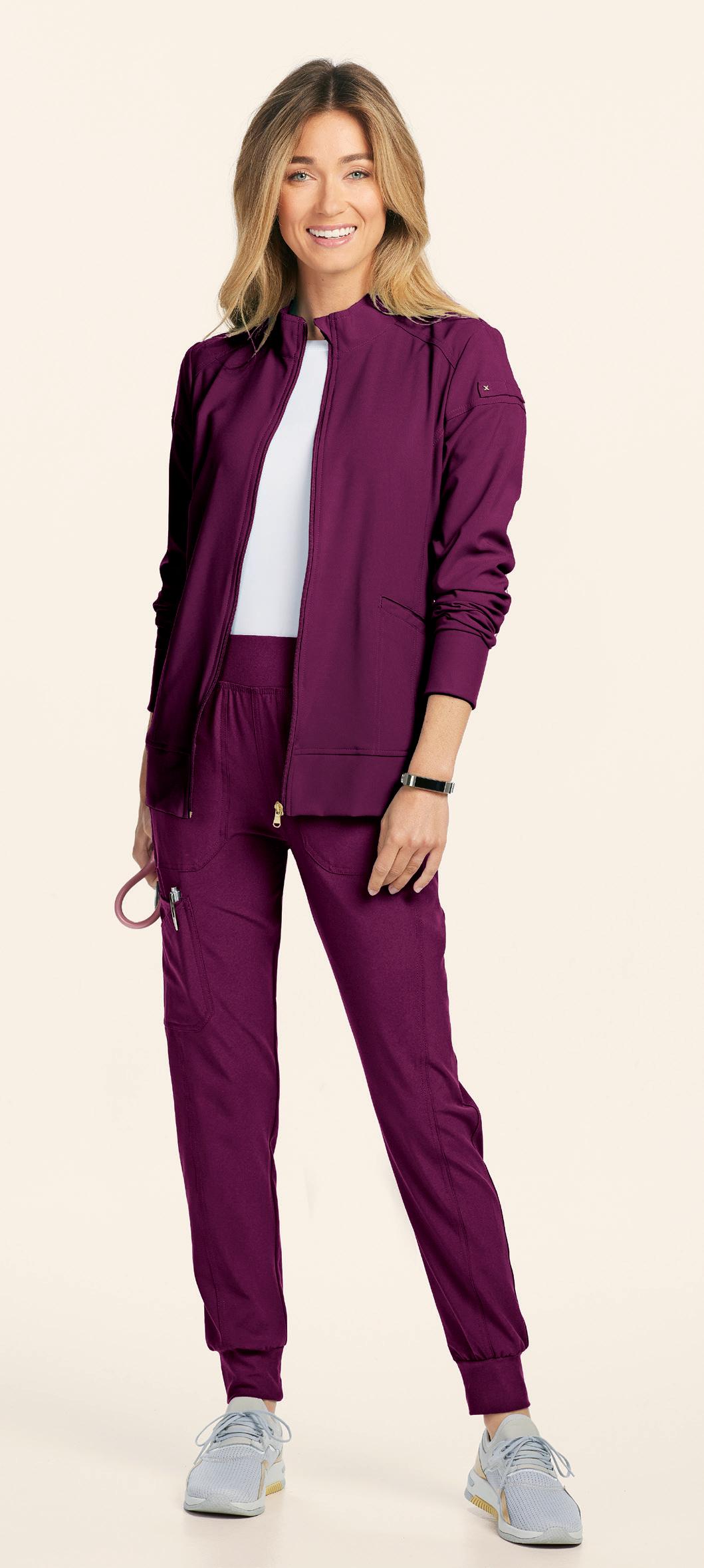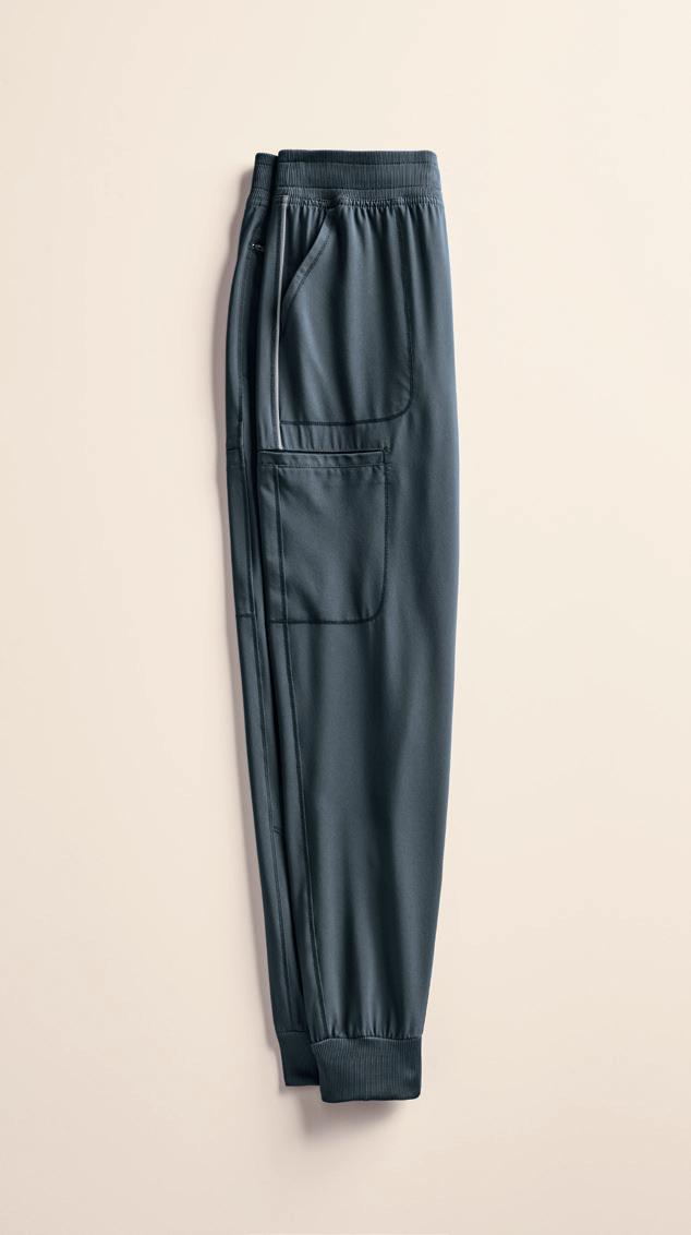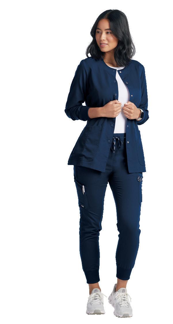 LEFT: GRSW871 React Round Neck Jacket 5 pockets, rib knit cuffs, antimicrobial fabric properties. Starting @ $42.99 GRSP550 Murphy 5-pocket Jogger Rib knit elastic waistband, zip fly, drawstring, knit cuffs, antimicrobial fabric properties. Starting @ $39.99 TOP RIGHT: GRST009 Wesley V-neck Top 3 pockets, badge loop, angled back yoke. Starting @ $32.99 GRSP507 Wesley Cargo Pant 4 pockets, zip fly, tack button closure. Starting @ $38.99 BOTTOM RIGHT: GRSW873 Gianna Round Neck Jacket 5 pockets, rib knit cuffs & back panels, antimicrobial fabric properties. Starting @ $38.99 LEFT: GRST124