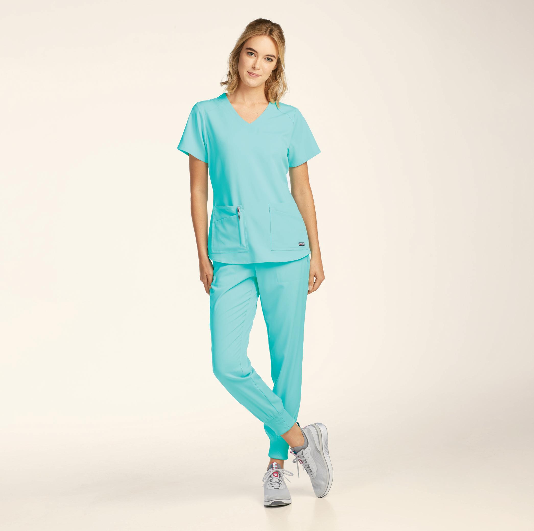 GRST045 Serena V-neck Top shown in Brilliance & Scarlet 3 pockets, rib knit neck detail & back panels, antimicrobial fabric properties. Starting @ $30.99 GRSP527 Carly Drawstring Cargo Jogger shown in Brilliance & Scarlet 7 pockets, rib knit waistband & cuffs, drawstring, antimicrobial fabric properties. Starting @ $36.99