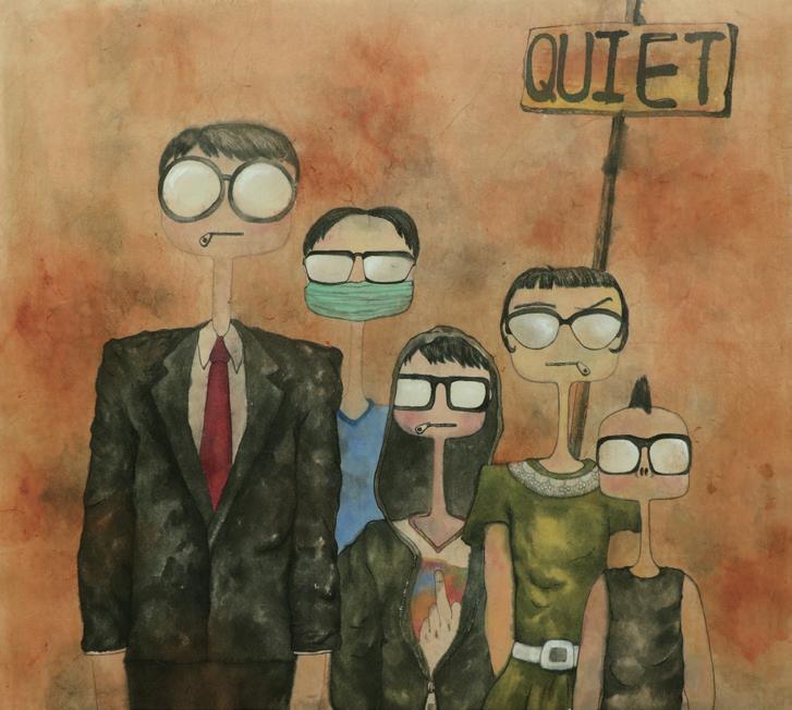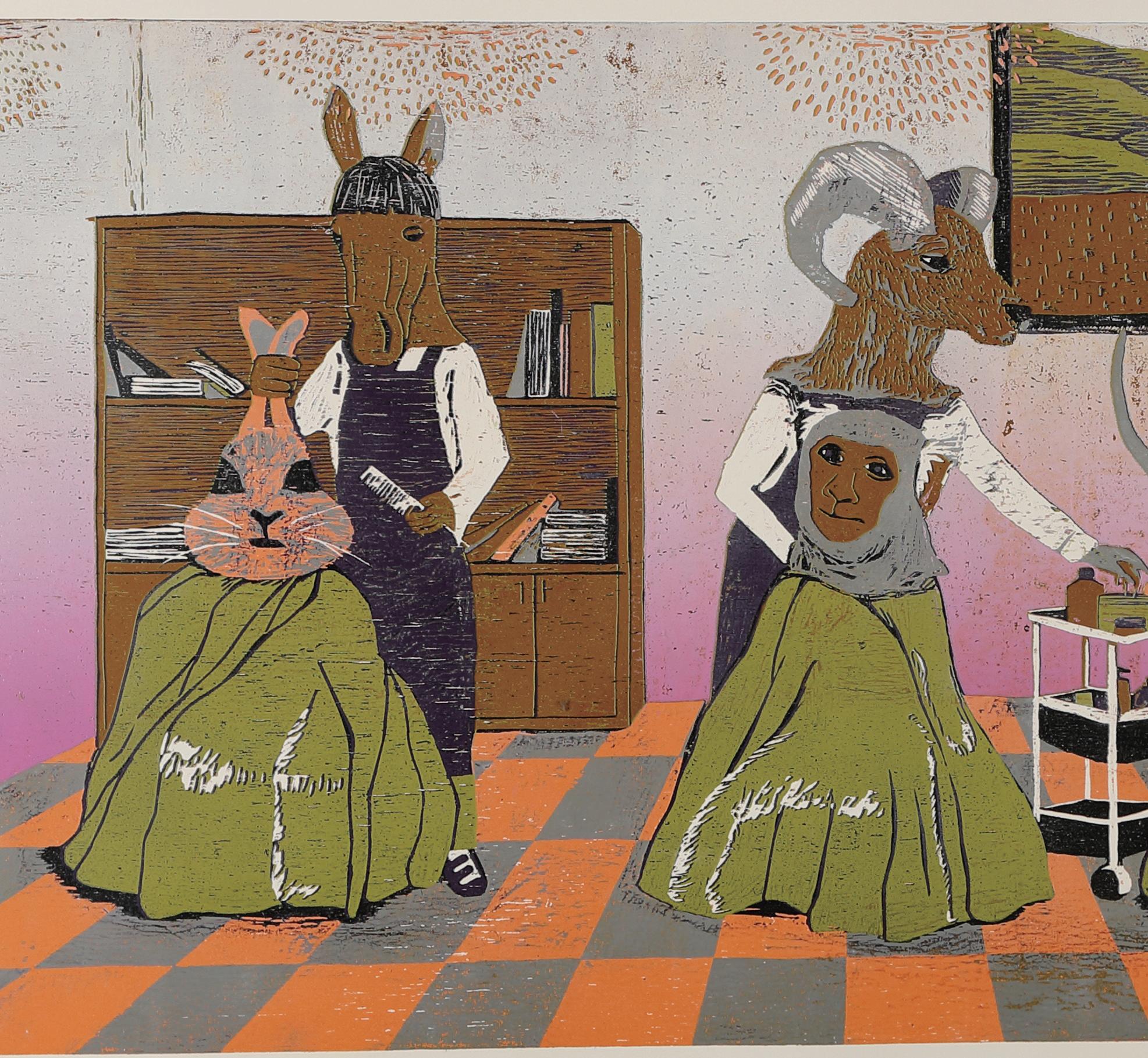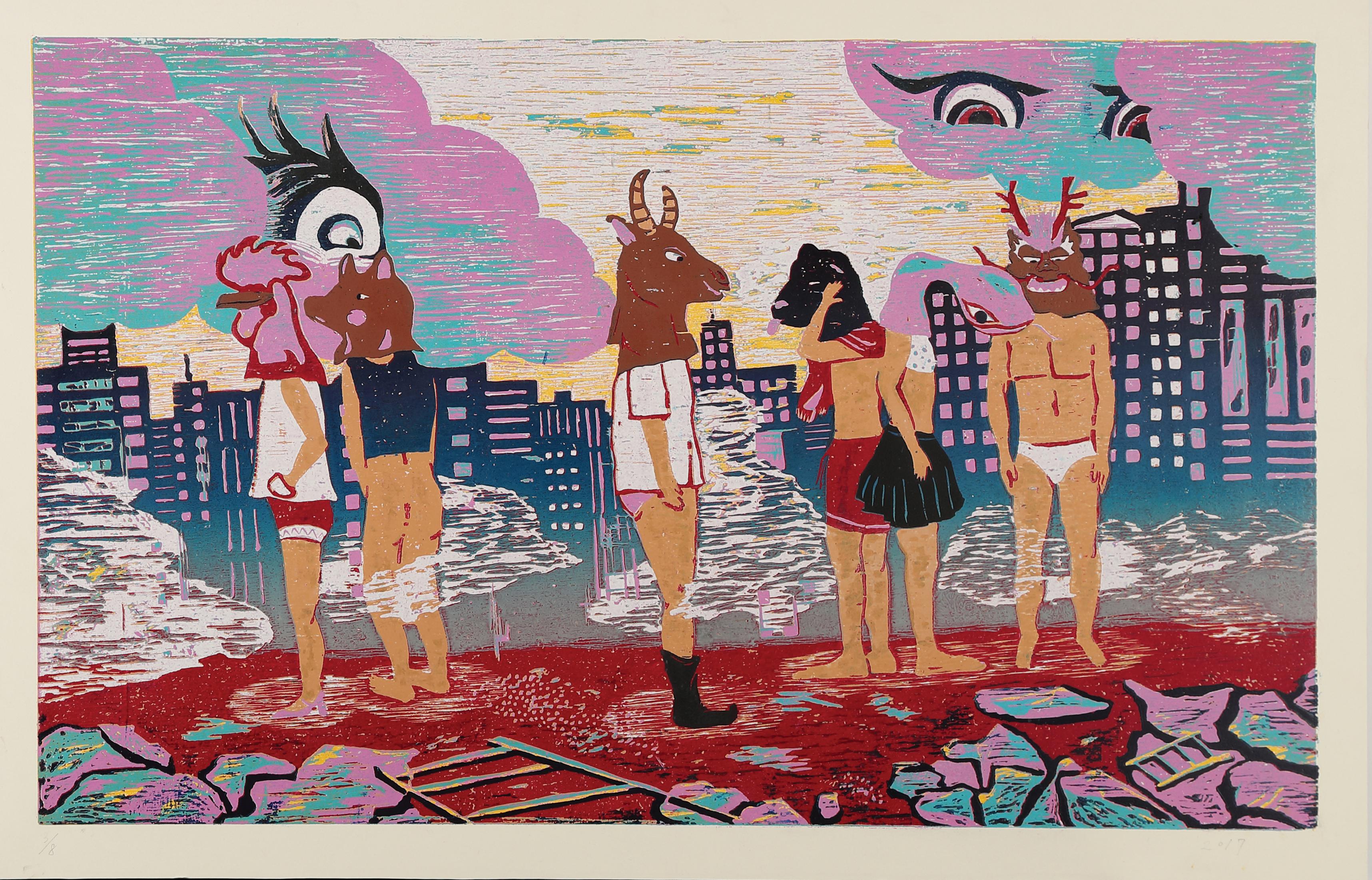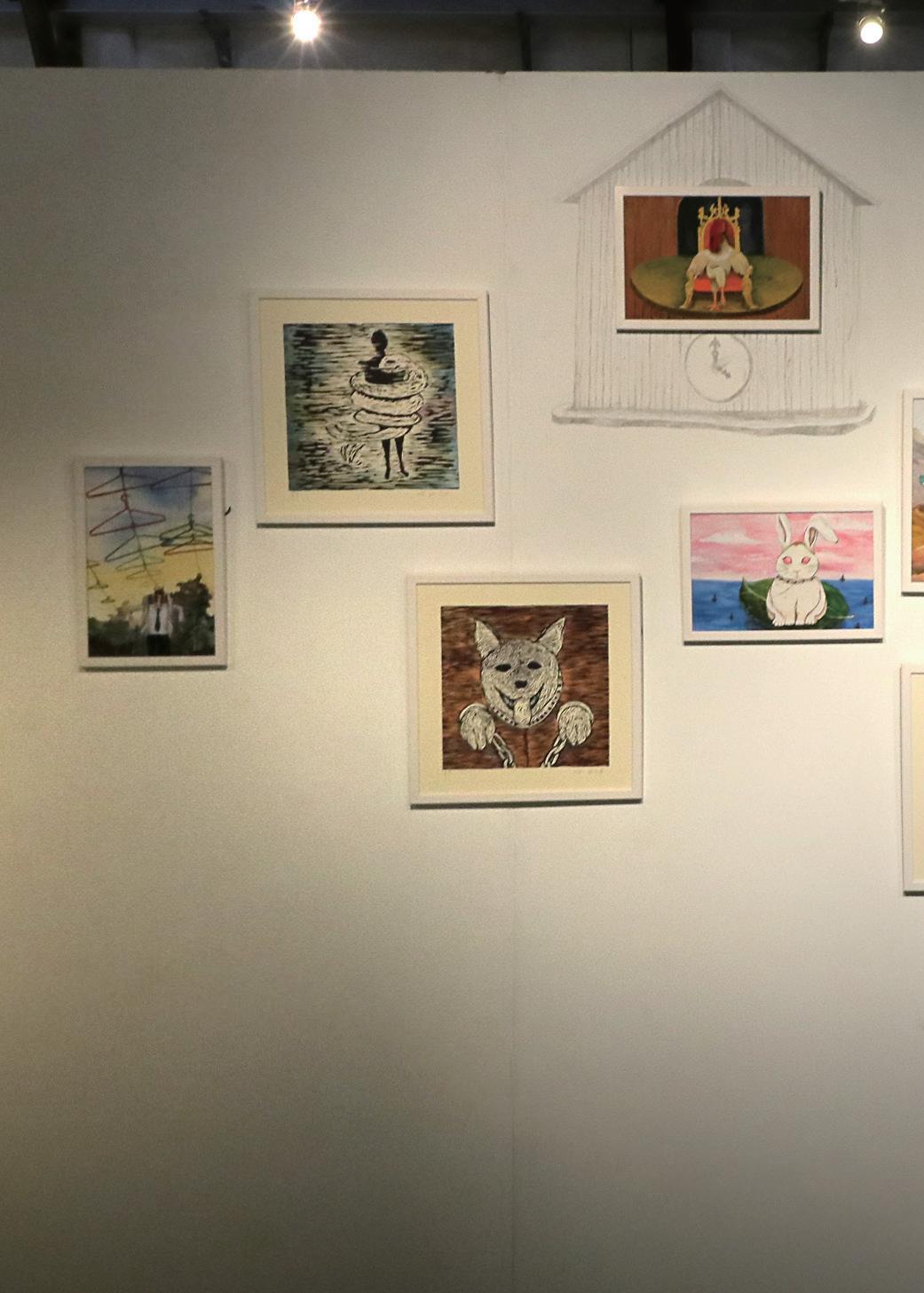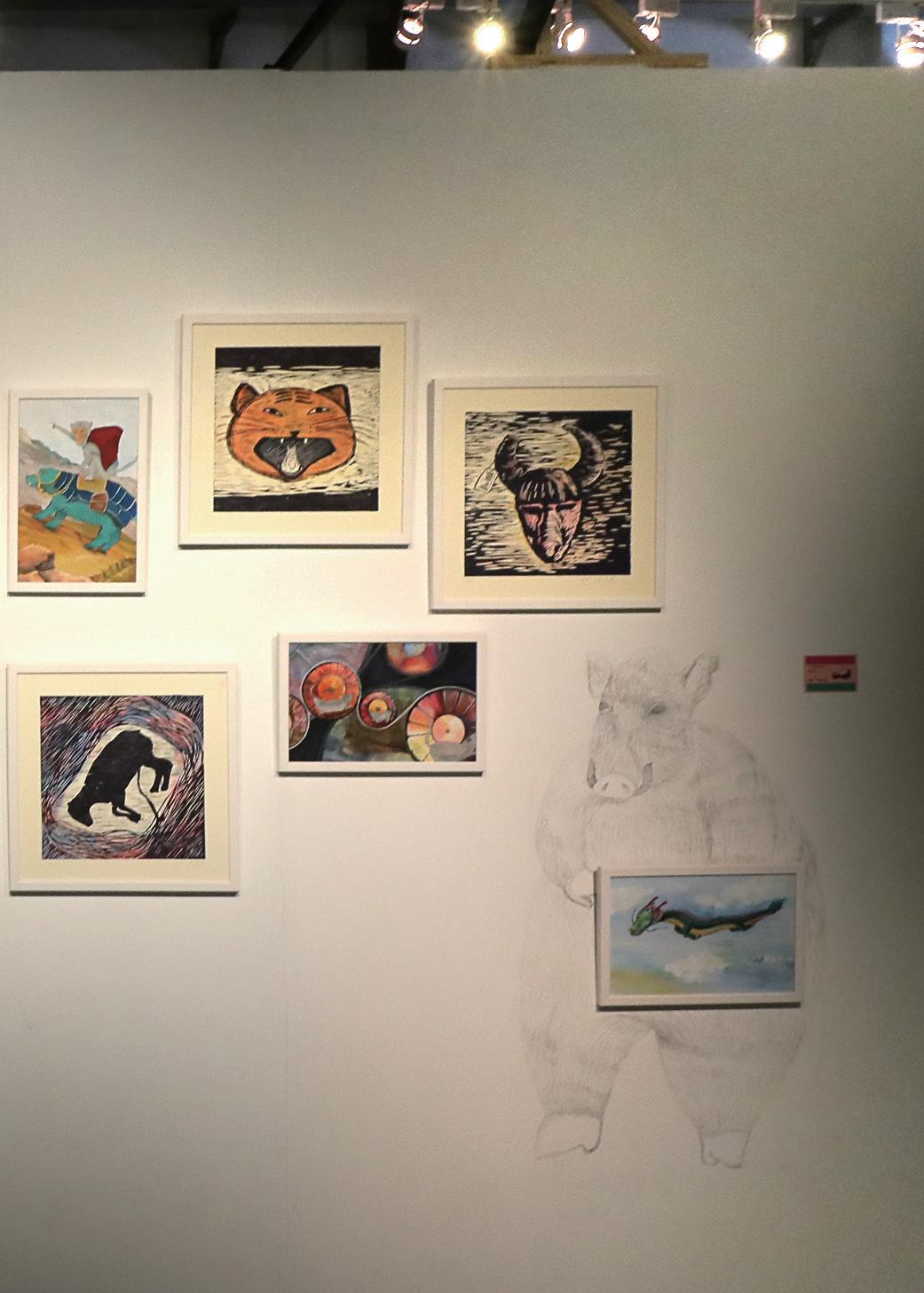 在這被建構好的世界中,人們被形塑成這個世界需要的樣貌, 他們不希望你標新立異。而我們則在這狹隘視野裡能看到的範 圍中載浮載沉,甚至沾沾自喜。或許我深深的埋在自以為逃不 出去的世界中無法自拔,但仍抱持著期待可以突破現況。 十二生肖之二 / 60x120cm / 木刻版畫 7