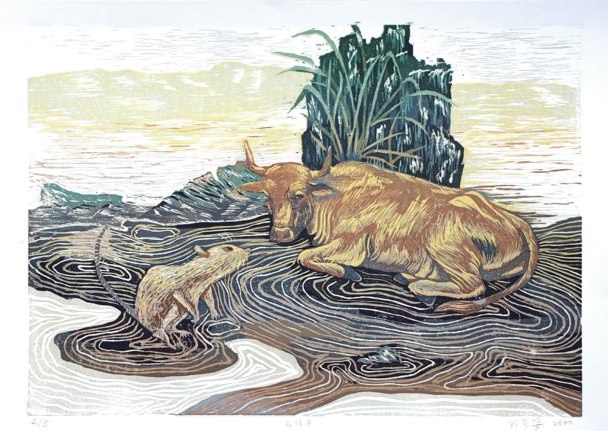鼠與牛的對話,不斷環繞的線條,象徵時間性的傳承。 旺旺牛 / 54.6x39.3cm / 單版複刻 11