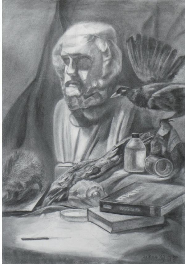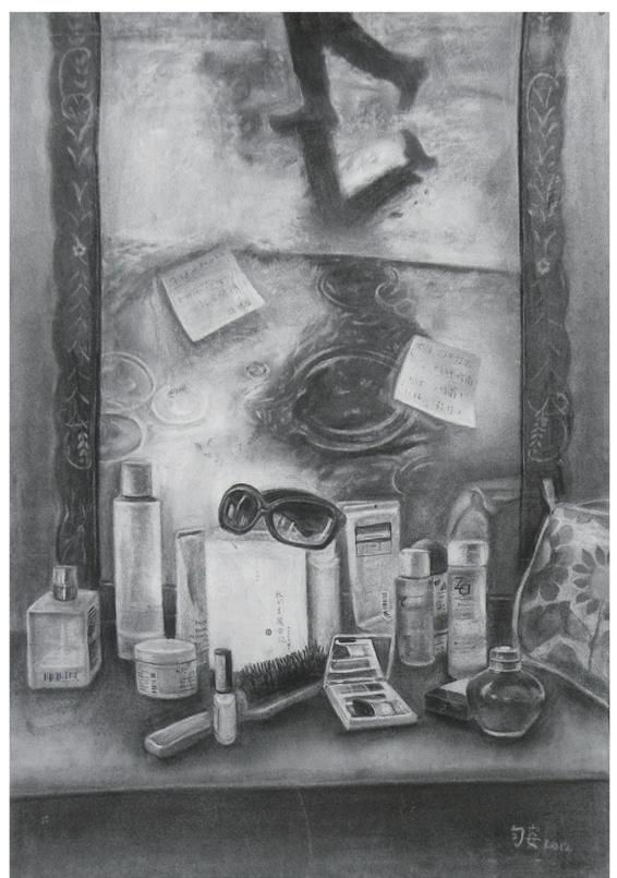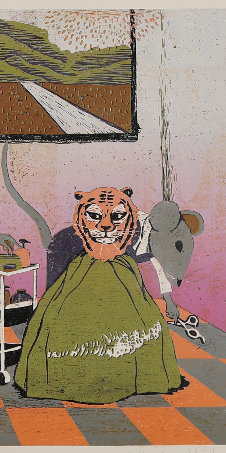 在這被建構好的世界中,人們被形塑成這個世界需要的樣貌, 他們不希望你標新立異。而我們則在這狹隘視野裡能看到的範 圍中載浮載沉,甚至沾沾自喜。或許我深深的埋在自以為逃不 出去的世界中無法自拔,但仍抱持著期待可以突破現況。 十二生肖之一 / 60x120cm / 木刻版畫 4