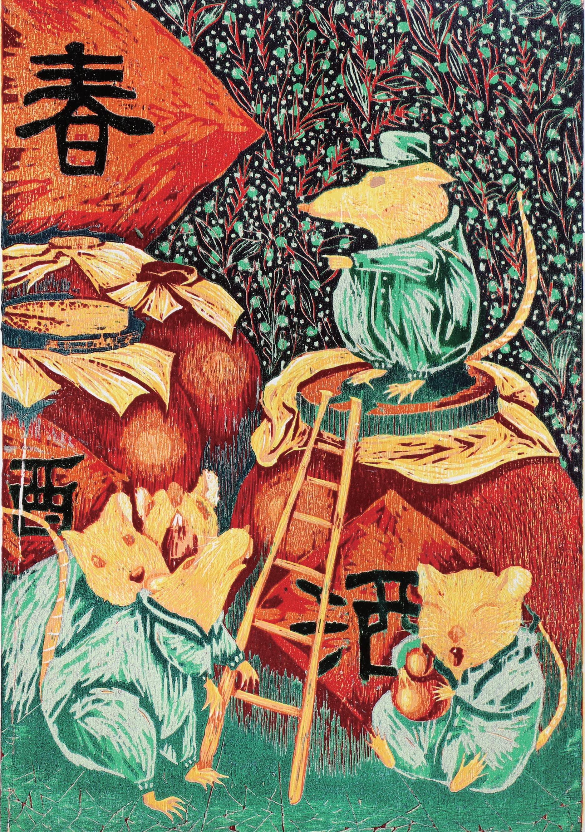 慶祝新年到來製作本年生肖鼠年。 鼠年喝春酒 / 54.6x39.3cm / 單版複刻 10
