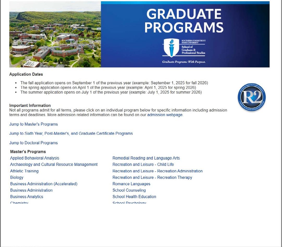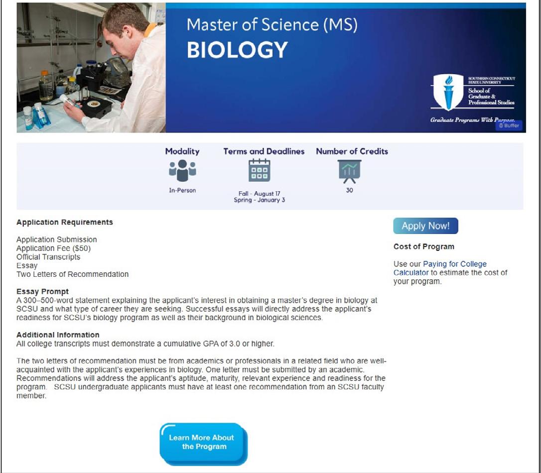 As part of this initiative, SGPS redesigned the graduate program page through a portal on Slate to provide a centralized, accurate, and accessible hub for programspecific pages and clear articulation of application requirements, deadlines, program delivery, credit hours, accreditations, updated links to the Graduate Catalog—essential information for prospective applicants.