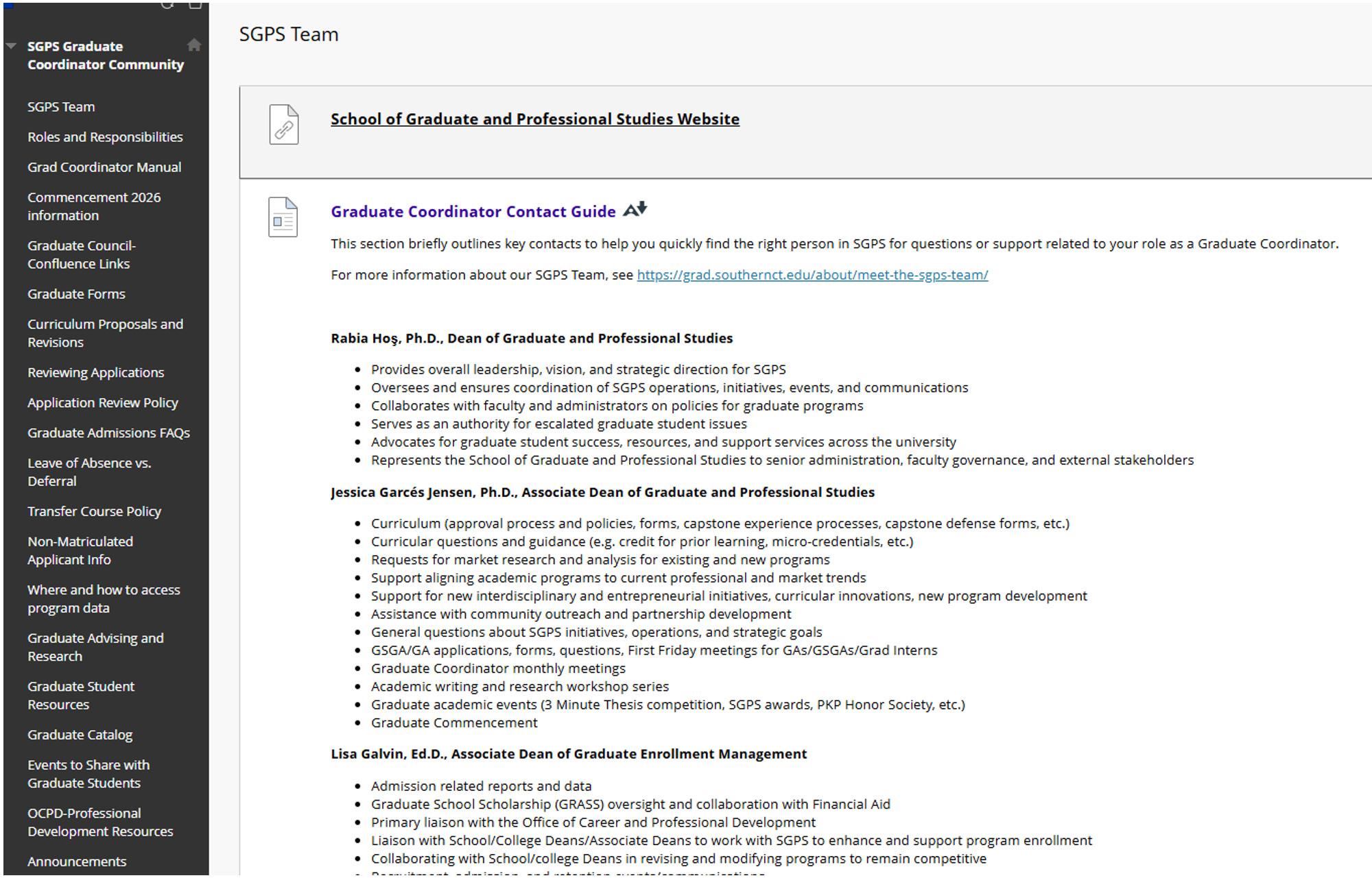 In Summer 2025, SGPS launched the Graduate Coordinator Community Organization (BlackBoard), a centralized platform designed to streamline access to essential resources, including admissions information, an updated graduate coordinator manual, forms, Graduate Council links, curriculum proposal processes and timelines, and other programrelated materials. Continuously updated based on coordinator feedback, this resource supports both new and experienced coordinators and underscores SGPS’s ongoing commitment to strengthening