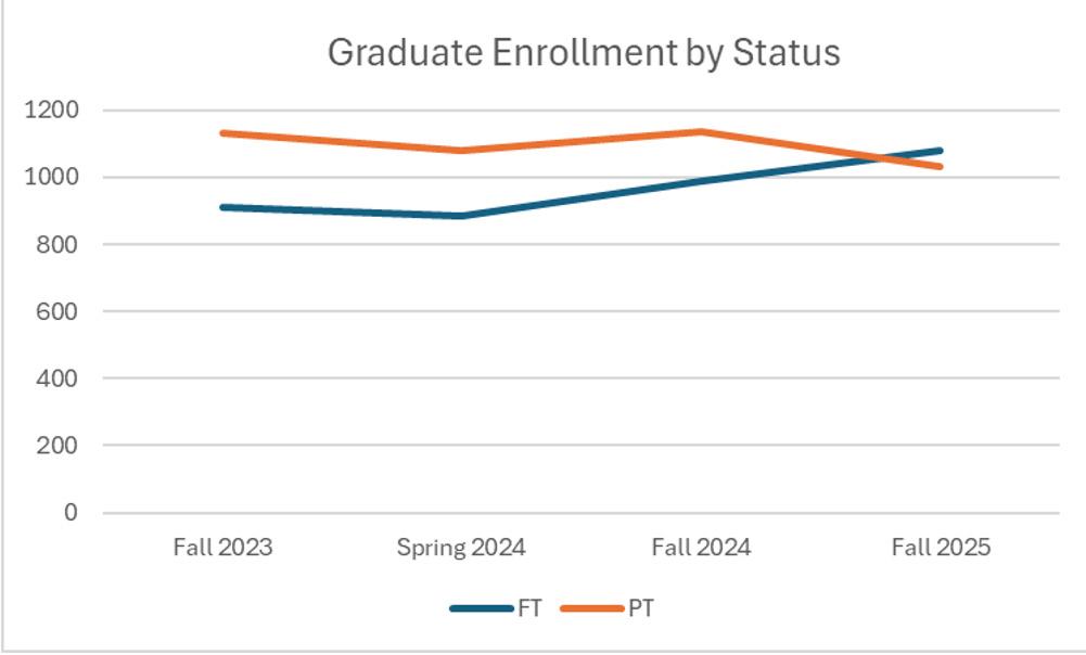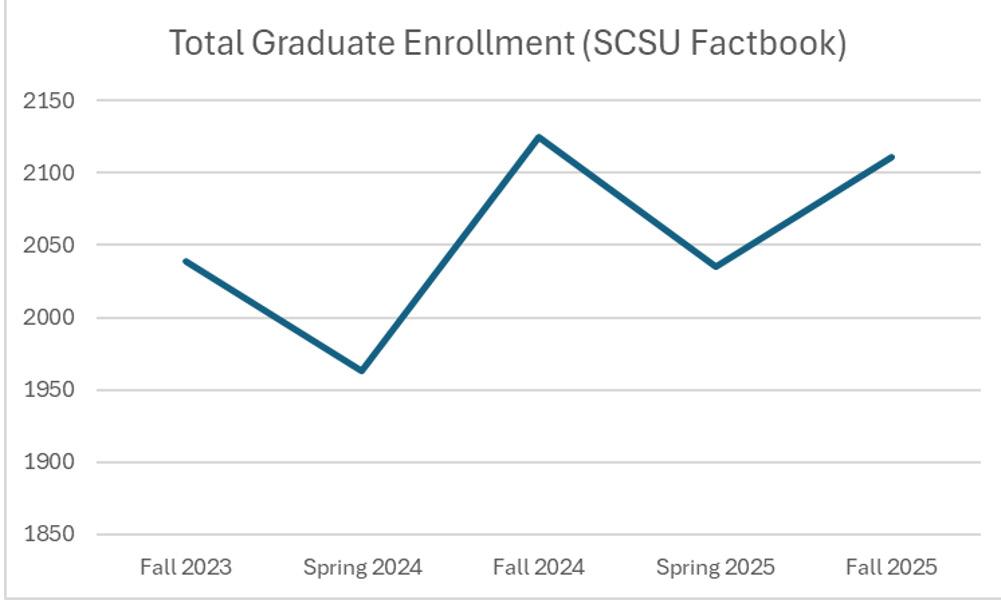 Aligned with SCSU’s Strategic Action Plan to double out-of-state and international enrollment by 2028, out-of-state graduate enrollment has grown by 29.4% since Fall 2024. While this segment is still modest, SGPS has embarked on several new initiatives aimed at strengthening recruitment efforts for out-of-state applicants.