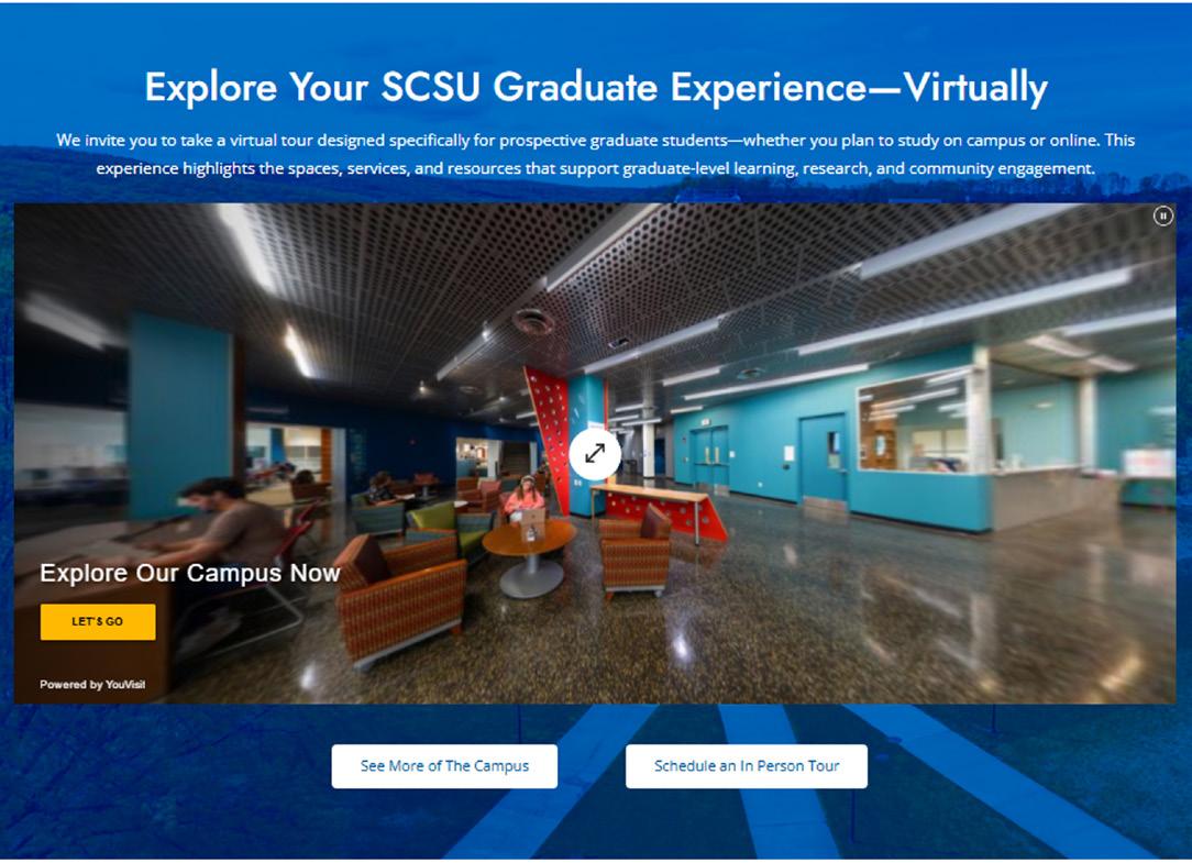 January 2025 marked the official launch of Southern’s first YouVisit Virtual Tour specifically designed to introduce prospective and current graduate students (online, on ground, in state, out of state, international) to Southern’s campus. This interactive experience highlights the spaces, services, and resources that support graduate-level learning, research, and community engagement at Southern. In the first 11 months, over 900 visitors toured the campus with the virtual tour, engaging with the tour for 20.3% longer than the YouVisit national average.