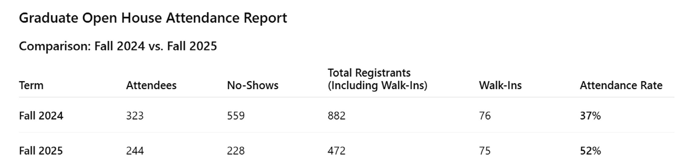 The School of Graduate and Professional Studies continued its efforts to strengthen graduate recruitment and engagement through enhanced event planning, targeted outreach, and improved communication strategies. A comparative review of the Fall 2024 and Fall 2025 Graduate Open House events demonstrates notable gains in attendee engagement and conversion from registration to participation.
