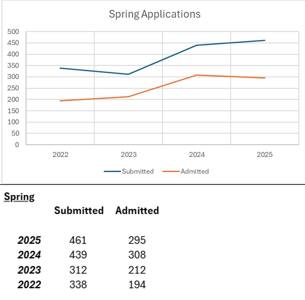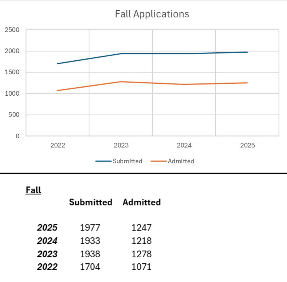 Spring applications increased by 5% from 2024 to 2025. For fall, applications rose by 2.3% during the same period. However, Spring admissions dropped slightly between 2024 and 2025, while fall admissions grew from 1,218 in 2024 to 1,247 in 2025. Additionally, graduate enrollment (FTE) in fall 2025 increased by 4.94%.