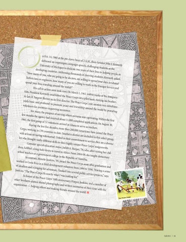 n Oct. 14, 1960 at the pre-daw n hour of 2 A delivered an im .M., then-Sen promptu cam ator John F. K paign speech ennedy University of , ch allenging stud Michigan to d en ts at the edicate two ye developing co ars of their liv untries. Addre es to helping ssing thousan “How many of people in ds of cheerin you, who are g students, Ken going to be d Technicians or n ed oc y asked, to rs, are willing engineers, how to spend your m an y d ay of spend your liv s in Ghana? you are willin es traveling ar g to work in th ound the wor e Fo re ig n Se rvice and ld?” His call to acti on soon took root. On March tion, Presiden 1, 1961, within t Kennedy esta weeks of his in blished the Pe in-law, R. Sarg ac augurae Corps on a pilo ent Shriver, as t b as is it , s n am fi rs in t d g ir his brotherously basic an ector. The Peac d profound: to e Corps’ core mission was si promote peace volunteers for multaneand friendship countries requ around the w esting assistan or ld by p ro ce viding . For many, the prospect of se rving others ov few months th erseas was ca e agency had ptivating. Wit received abou 1961, the first hin the first t 11 ,0 00 completed ap group of 51 vo plications. On lunteers arrive August 30, d in Ghana to During the la serve as teach st five decades er s. , more than 20 Corps, workin 0,000 Americ g in 139 coun ans have join tr ie s to d ate. Southern ed the Peace with at least 66 alumni are in having volunt cluded in this eered. United lot who brough select group, in their comm t vastly differe itment to serv nt skills to th ic e, they are a d eir highly uniq iverse Consider spec ue Peace Corp ial education s’ assignments. m ajor, Judith A. dren, fulfilled Harper, ’76, w a long-held d ho, after raisin esire to travel school teacher to g her chilA fr ic a. From 2004-0 s at a governm 8, she taught ent college in el em the Republic entary In contrast, M of Namibia. inette Junkin s, ’93, joined th worked in Cos e Peace Corps ta Rica as a ch soon after grad ild developm of idealism an uation and en t vo lunteer from d a longing fo 1994 to 1996. r adventure, I “H Junkins. “The av ing a sense looked into se Peace Corps fi veral public se t exactly what rv ic e p ro je cts,” says I was looking In honor of th for.” e Peace Corps’ 50th anniversa other Souther ry, Harper, Ju n alumni shar nkins, and a n ed p h ot og raphs and wri organization umber of — helping ot tten memorie hers and mak s of their tim e ing friends ar with the ound the wor ld. n