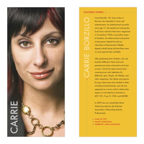 southern stories Carrie Borzillo, ’92, knew early on that she was interested in music and entertainment. An entertainment journalist since age 17, she started out covering the local music scene for free music magazines in Connecticut. While a journalism major at Southern, her determination and power of persuasion helped her land an internship at Entertainment Weekly, despite initially being told that there were no such opportunities available. After graduating from Southern, she was hired by Billboard. Hard work and perseverance have continued to drive her success. Carrie has spent several years covering music and celebrities for Billboard, Spin, People, US Weekly, and other magazines. Her talents and passion for pop culture have also resulted in three critically-acclaimed books, and she has appeared as a music and/or relationship expert on such television channels as MTV, VH1, Fuse, E!, CNN, and MSNBC. In 2009 she was named Best Music Writer/Journalist by the National Association of Recording Industry Professionals.