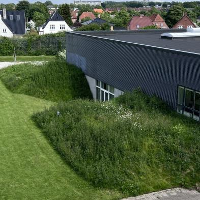Der er ikke etableret grønne tage. Hal-taget viste sig ikke at være egnet ift. øget vægt, og det flade tag på skolens sydfløj står foran en renovering indenfor en årrække. I den forbindelse vil det blive vurderet, hvorvidt det giver mening at opsætte solceller eller at etablere et grønt tag.