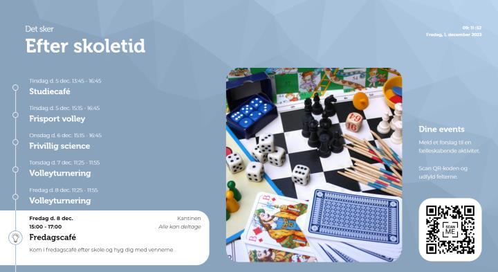 Der har på skolen altid været tilbudt forskellige frivillige aktiviteter, men i denne strategiperiode er intensiteten steget, og informationen om de forskellige fællesskabende aktiviteter efter skoletid er blevet samlet. Der er således opsat en stor skærm i skolens indgangsparti, som kun viser kommende arrangementer. Samme skærmbillede vises i samtlige klasselokaler, inden underviseren i hver time erstatter billedet med dagens stof. Skærmbilledet indeholder en QR-kode, hvorigennem elever kan ønske kommende aktiviteter – og tilkendegive interesse for at være med til at arrangere. Ligeledes findes nu en plakatsøjle i indgangspartiet, hvor mere udfoldet information om aktiviteterne kan formidles. Man kan se den samlede aktivitetskalender på skolens hjemmeside. Aktiviteterne spænder vidt; fra kor til loppemarked, fra musical til fodbold, herunder klasseture til stadion og OB-kampe. Der er yderligere etableret en “eventgruppe” på skolen – en gruppe af elever, som til tider med hjælp fra flere elever, arrangerer forskellige events med relativ kort planlægningsfase, bl.a. har eventgruppen arrangeret brætspilsaften med fællesspisning samt medvirket i tilrettelæggelse af julefrokost i en forlænget spisepause i december.