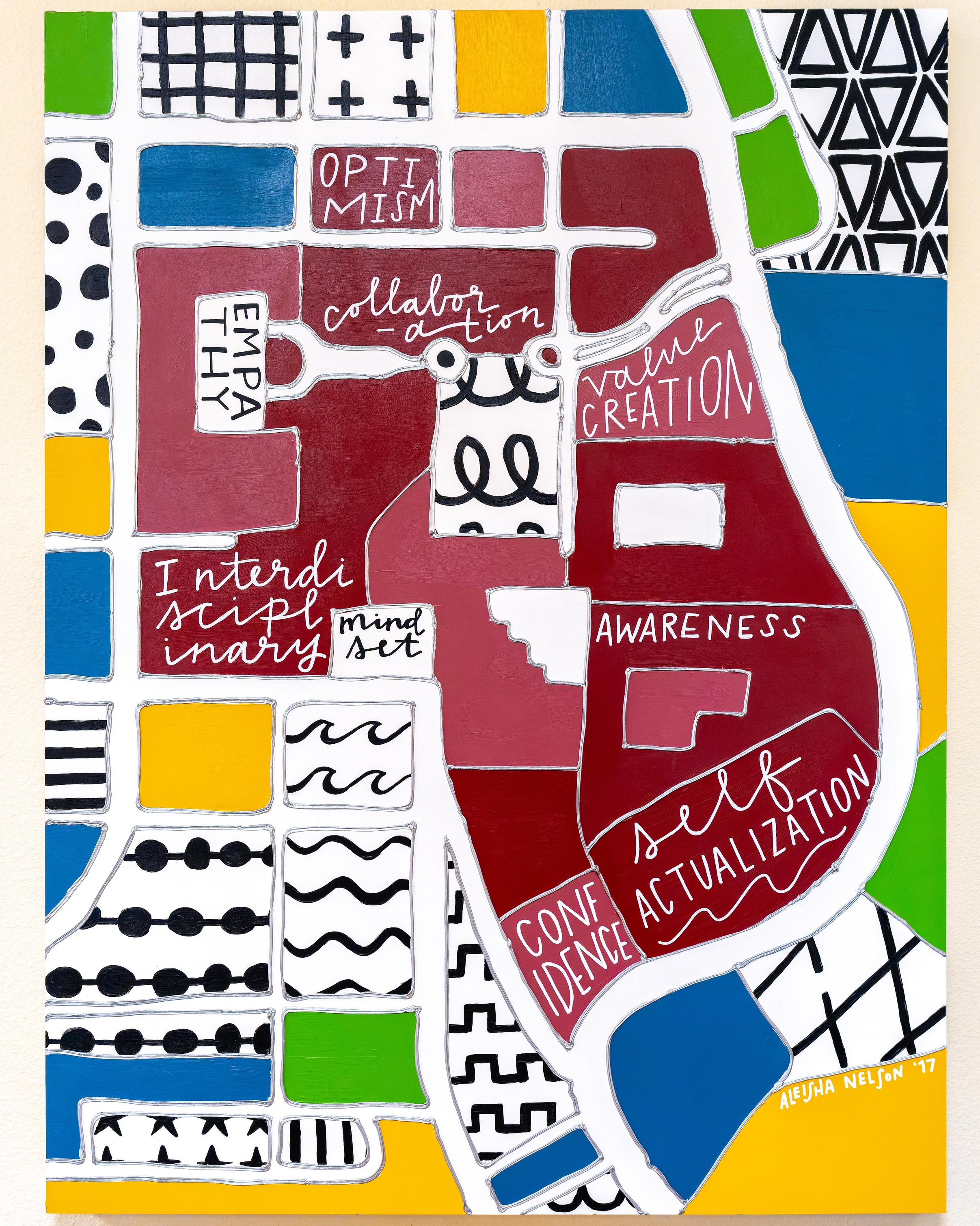 Aleisha Nelson BS '17, MS '19 (Computer Science, Software Engineering) is a cartography artist based in San Francisco, California who specializes in map paintings, murals, art installations and graphic design. This piece is a map of SCU with words that represent Ciocca Center and the Entrepreneurial Mindset